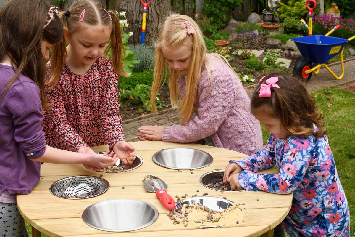De ronde outdoor zandspeeltafel van slijtvast grenenhout is uitgerust