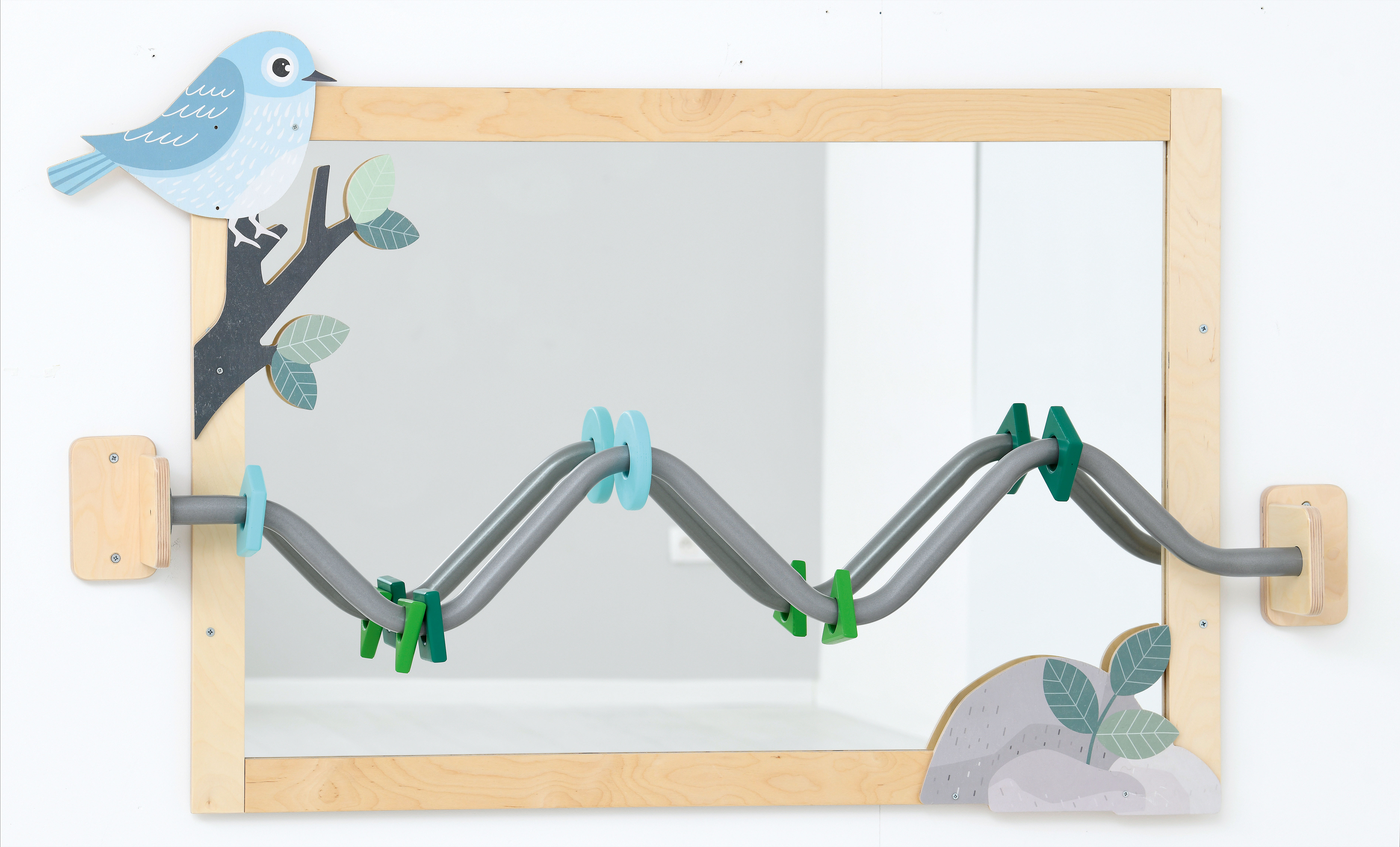 Spiegelend multiplex frame waarop u leuke applicaties van gekleurd MDF kunt plaatsen A9203160 In het midden van de spiegel kunt u bovendien een metalen loopbeugel plaatsen waarop gekleurde houten zitten. A9203170 en A9203180.