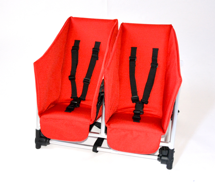 De twee babyzitjes hangen in een bijbehorend frame dat overdwars op de bankjes van de Walking Wagon bolderkar kan worden geplaatst