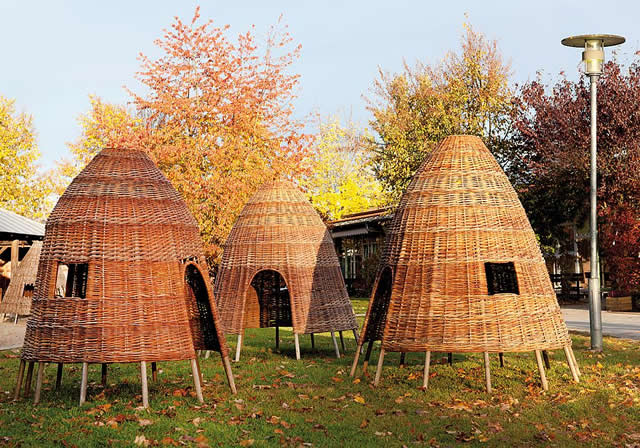 De samenstelling van de verschillende afmetingen grote wilgenhutten tot een "wilgen-camp" bevordert het gemeenschapsspel.