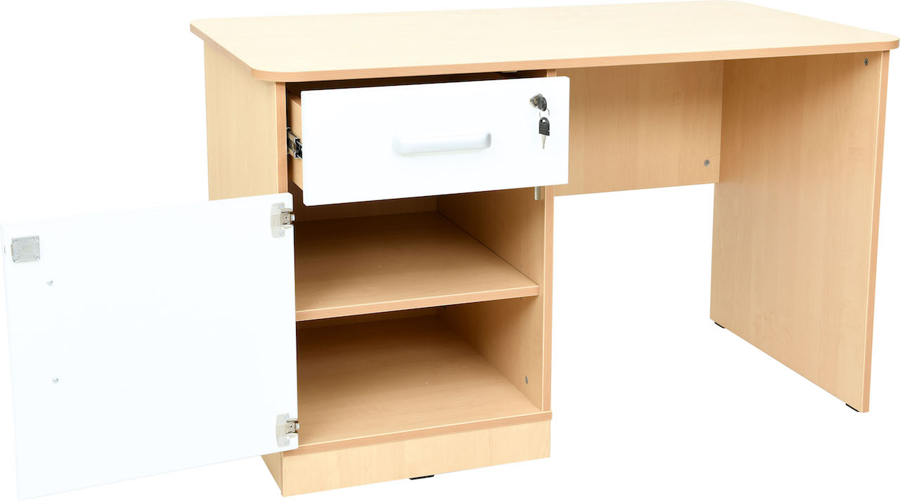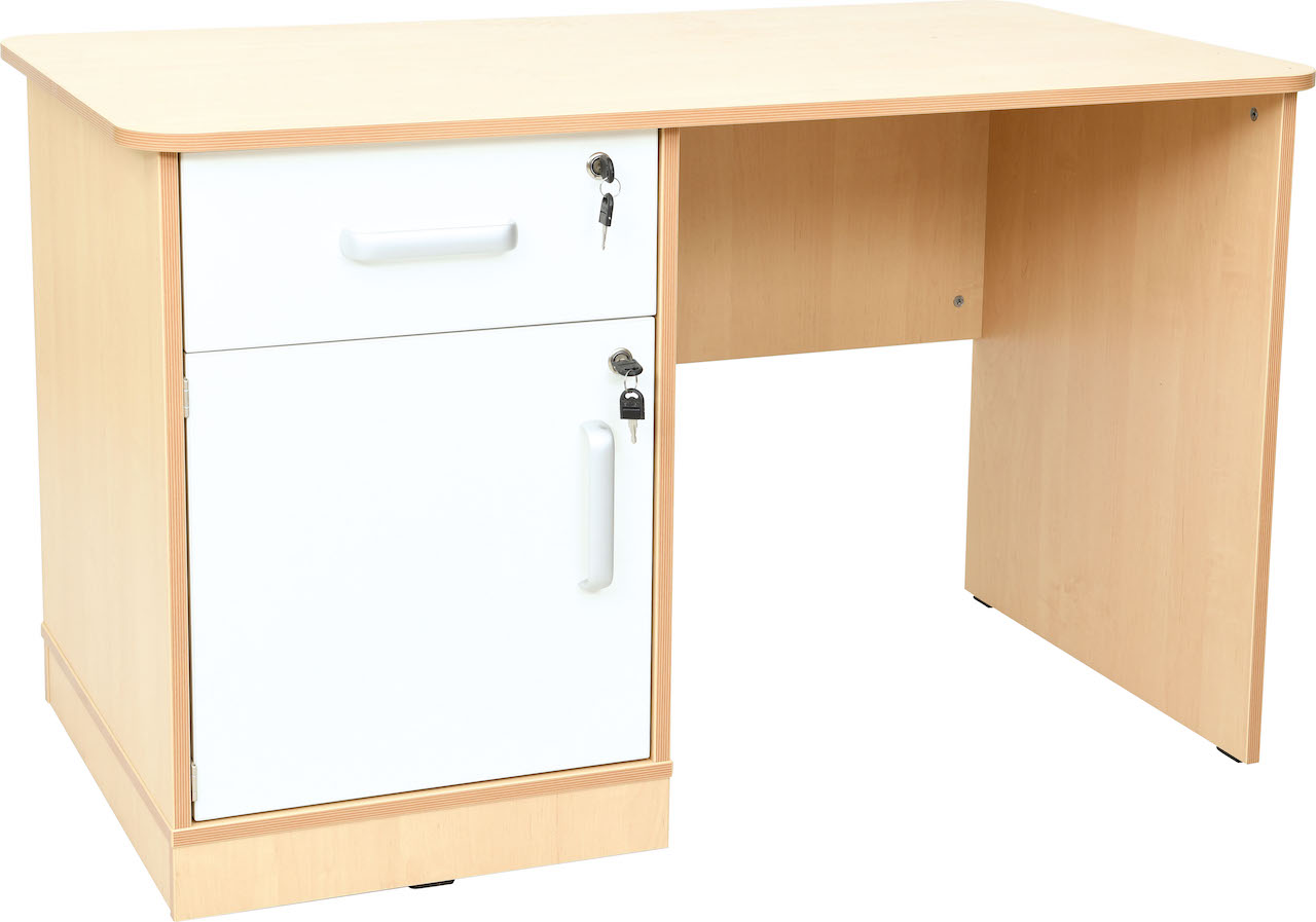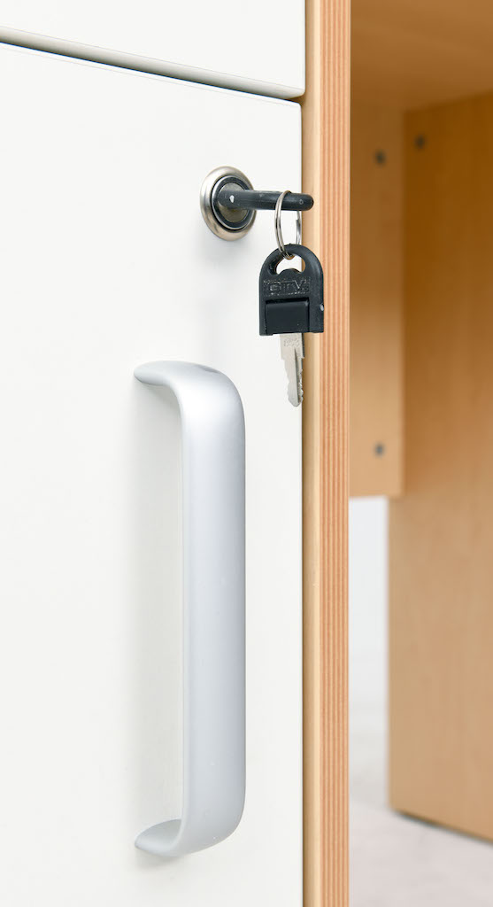 De bureaus worden uitgevoerd met een kastje en lade, beide voorzien van slot,