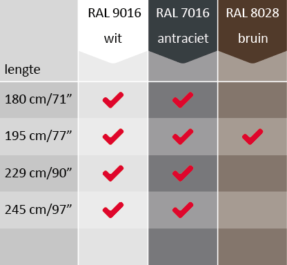 - kleuren: wit, bruin en antraciet (andere kleuren en lengtes mogelijk op aanvraag)