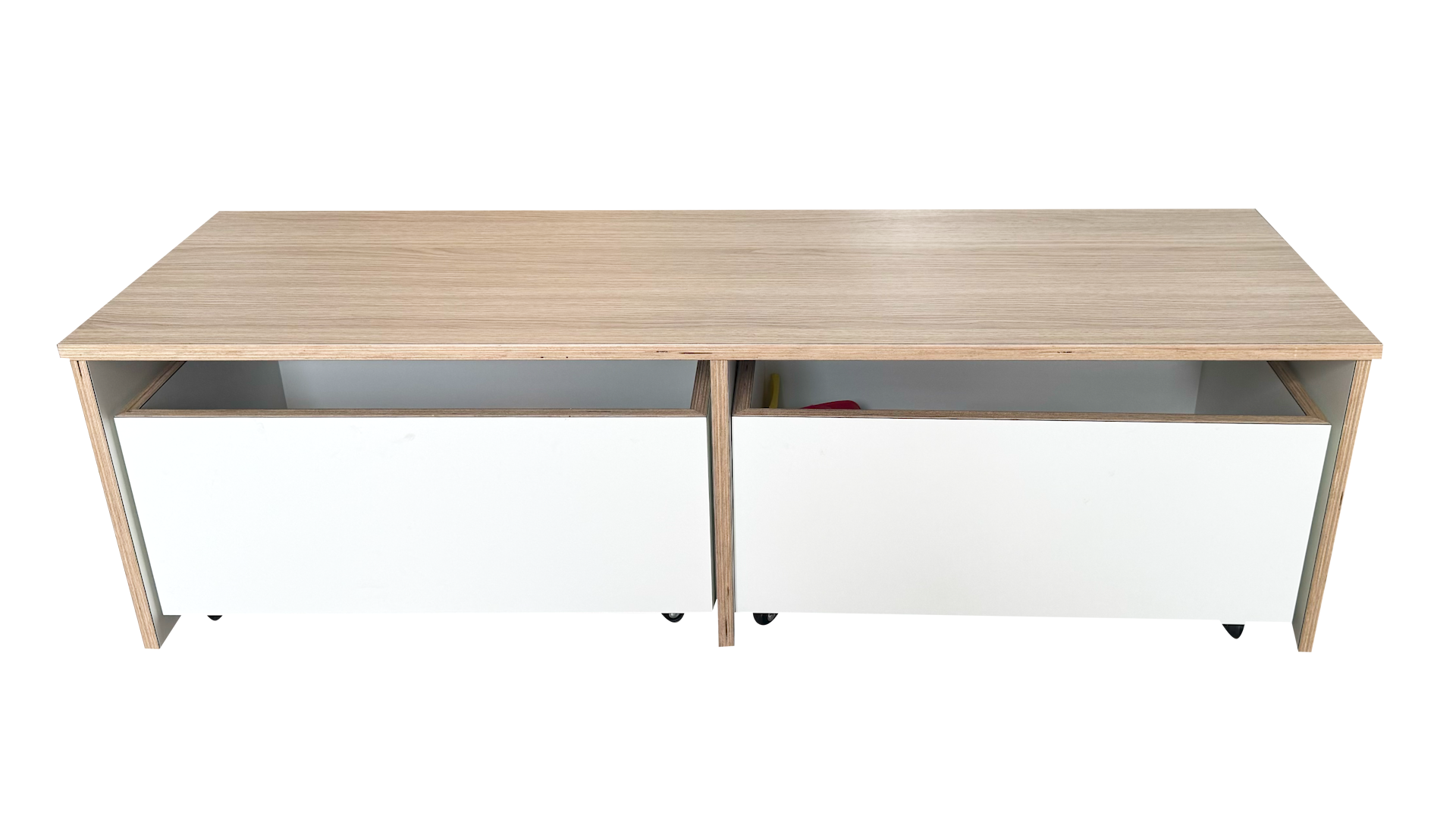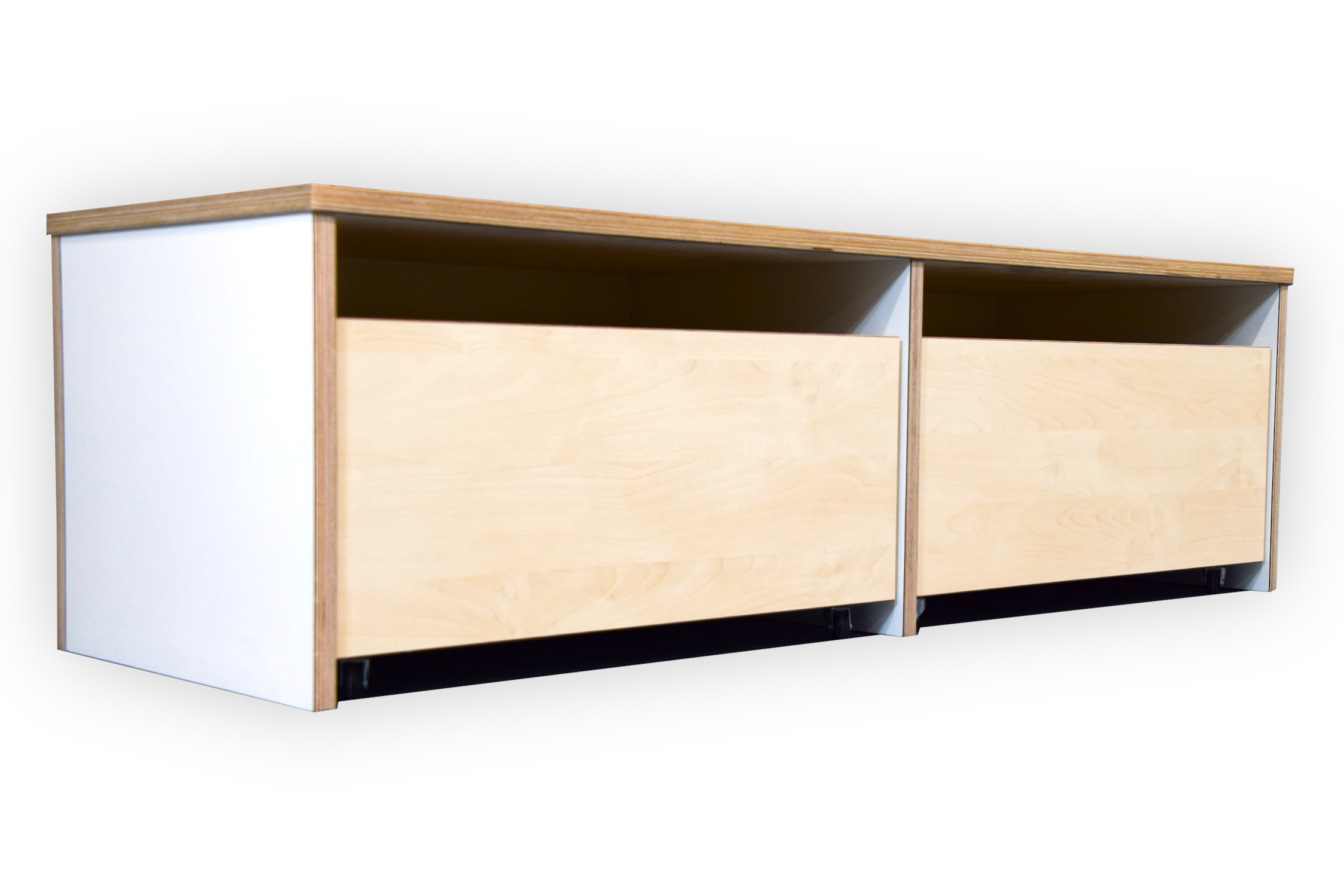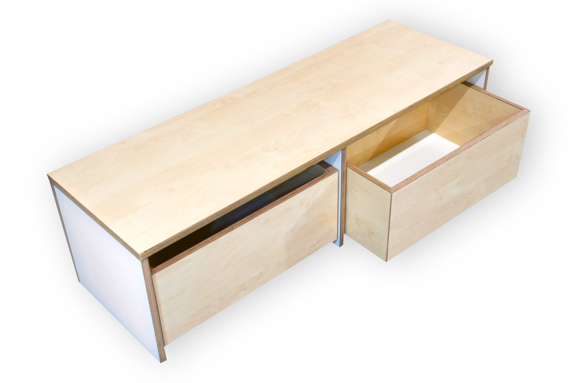 De bank en rolbakken zijn opgebouwd uit 18 mm berken multiplex met witte HPL toplaag.