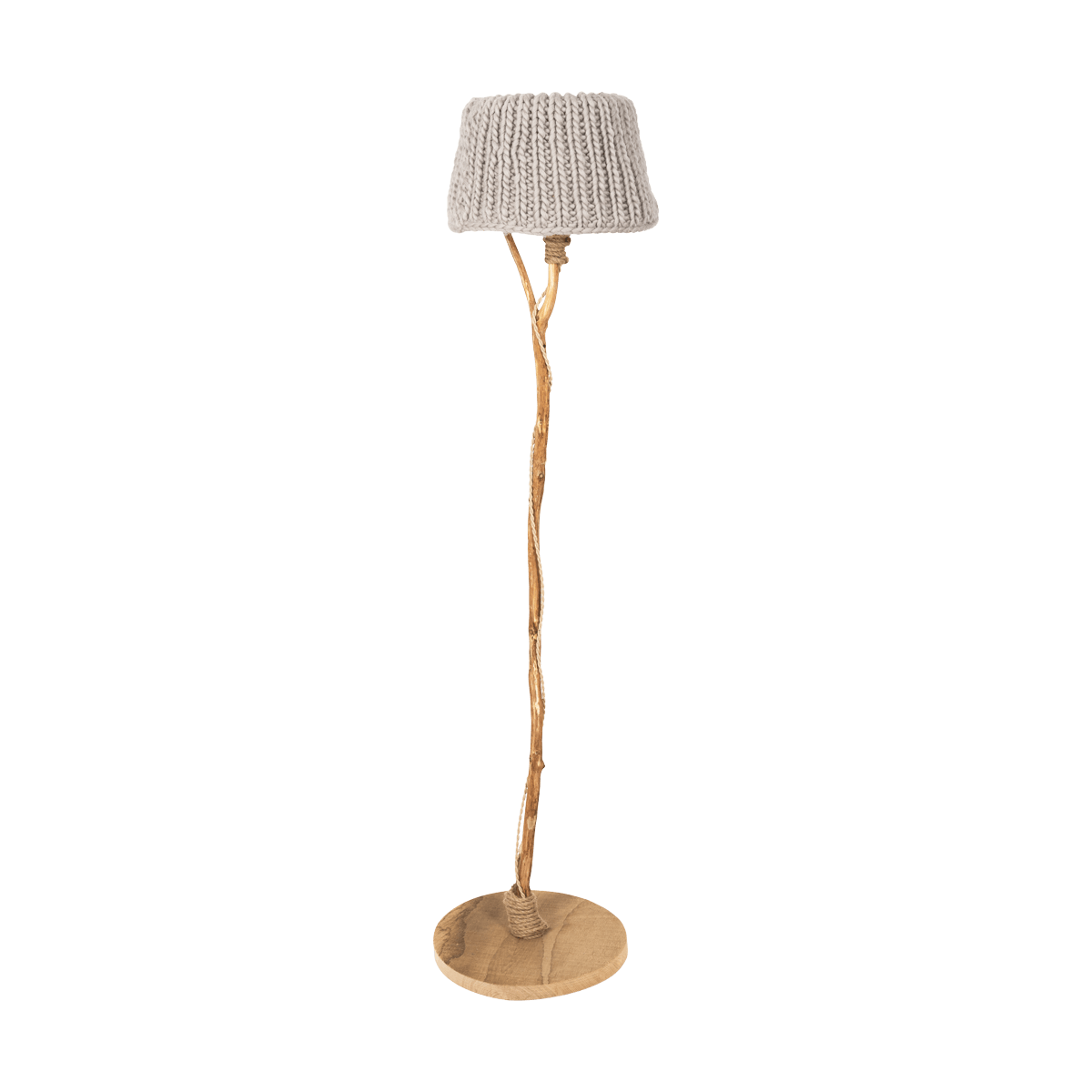 Een houten vloerlamp met eiken voet en sierlijke tak.