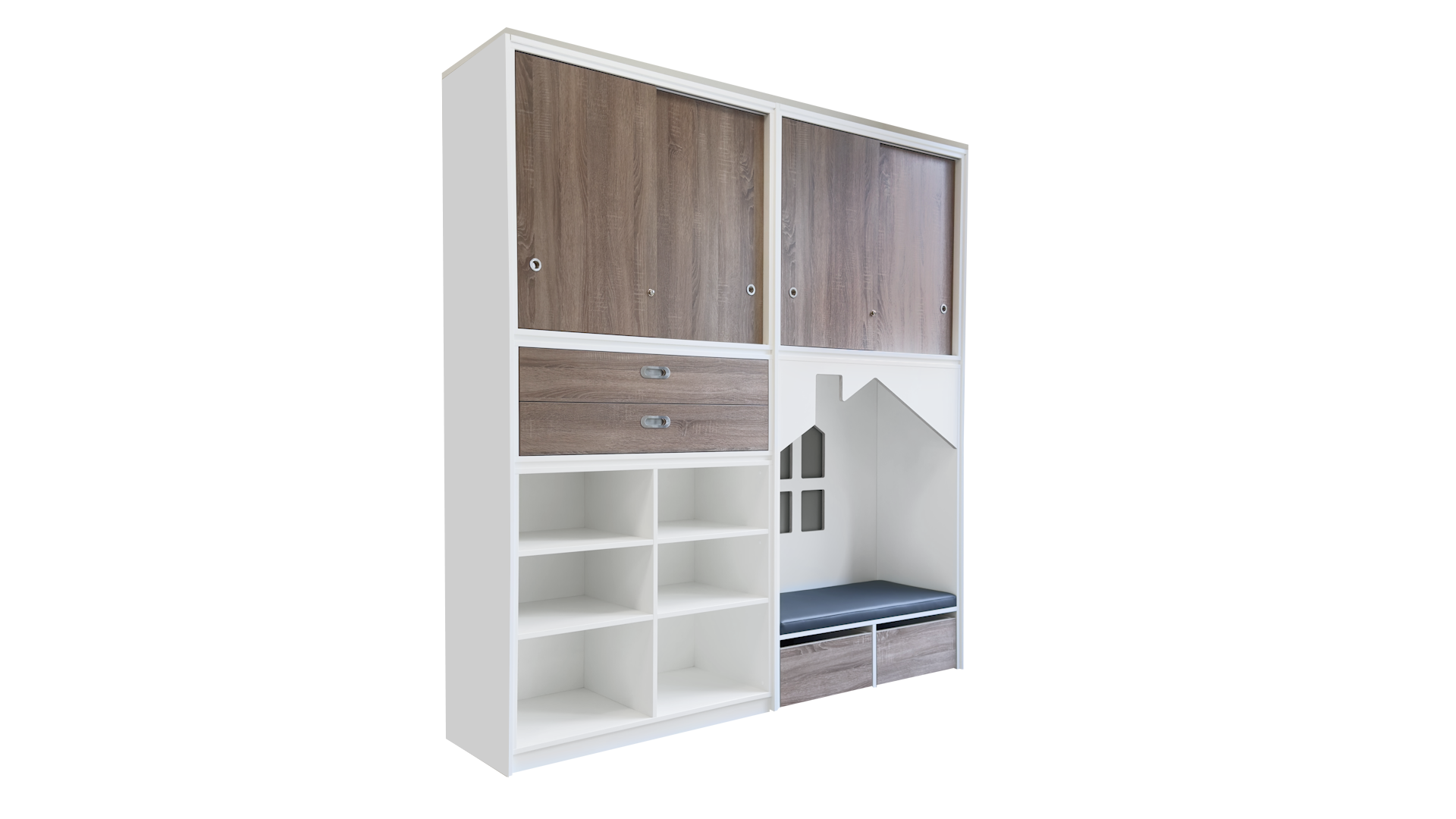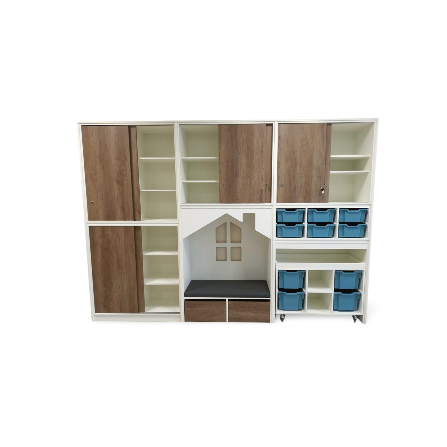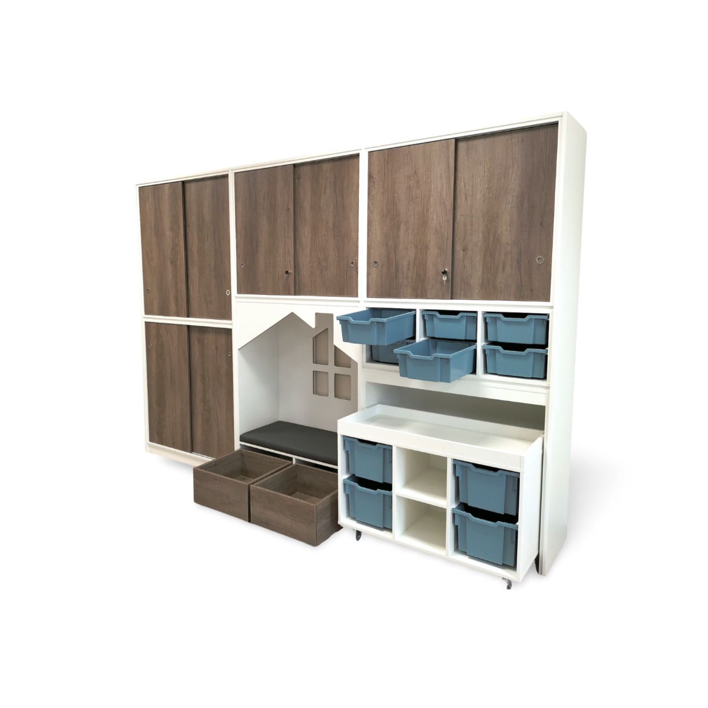 De schuifdeuren en rolbakken zijn leverbaar in een houtdecor naar keuze.Ā