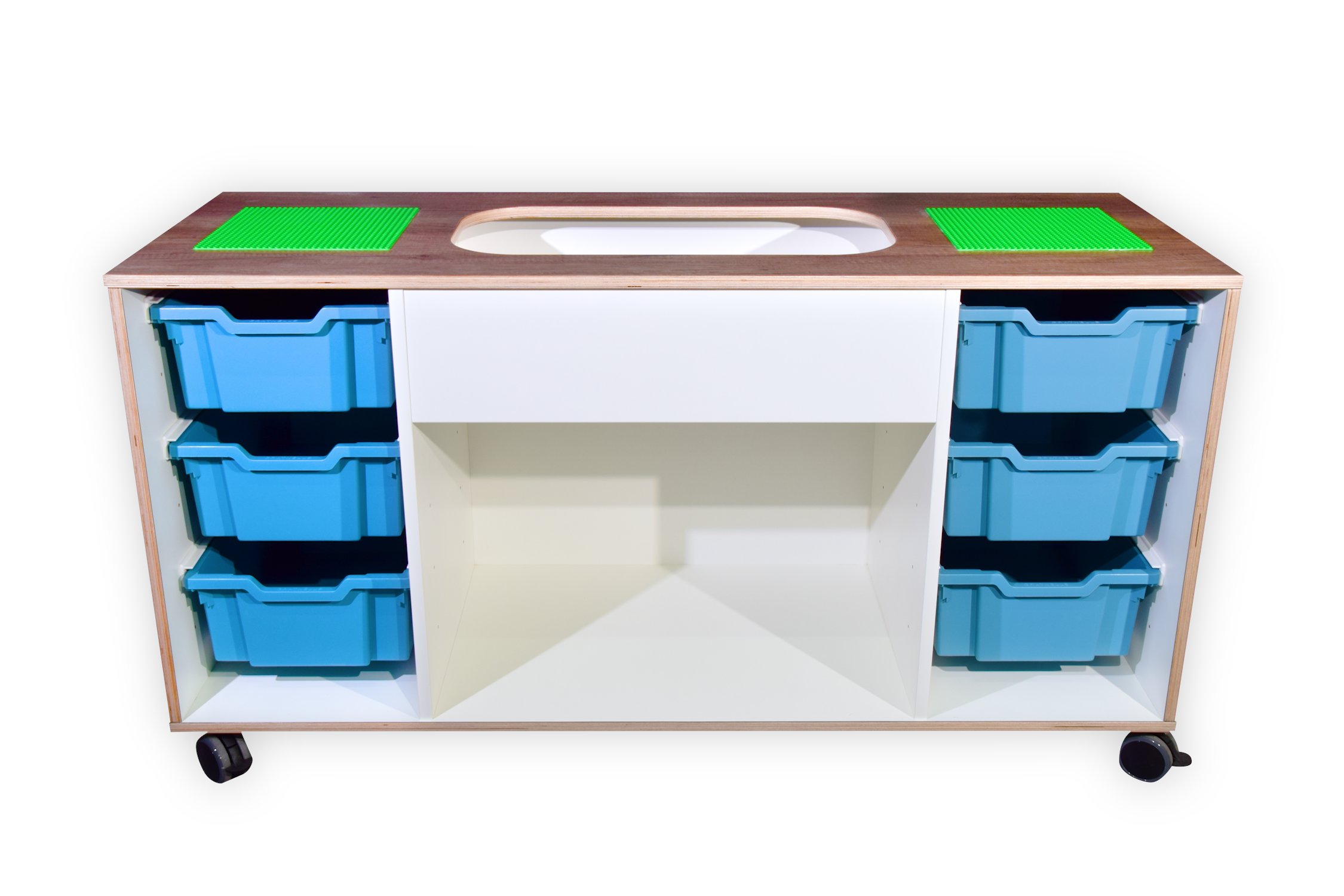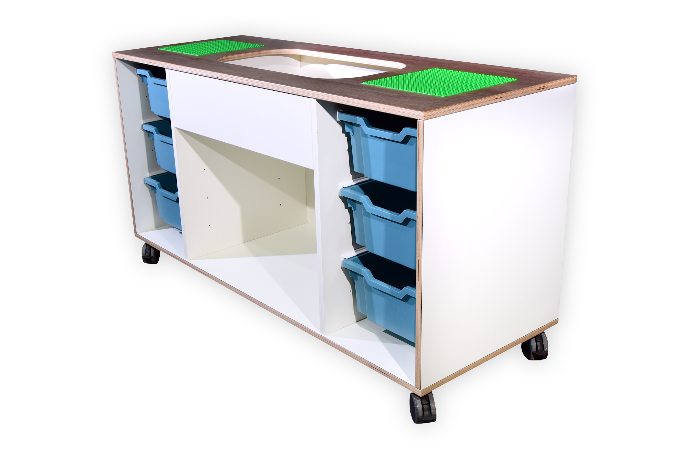 Bouwkast met 2 Legoplaten en open opbergvak in het midden.