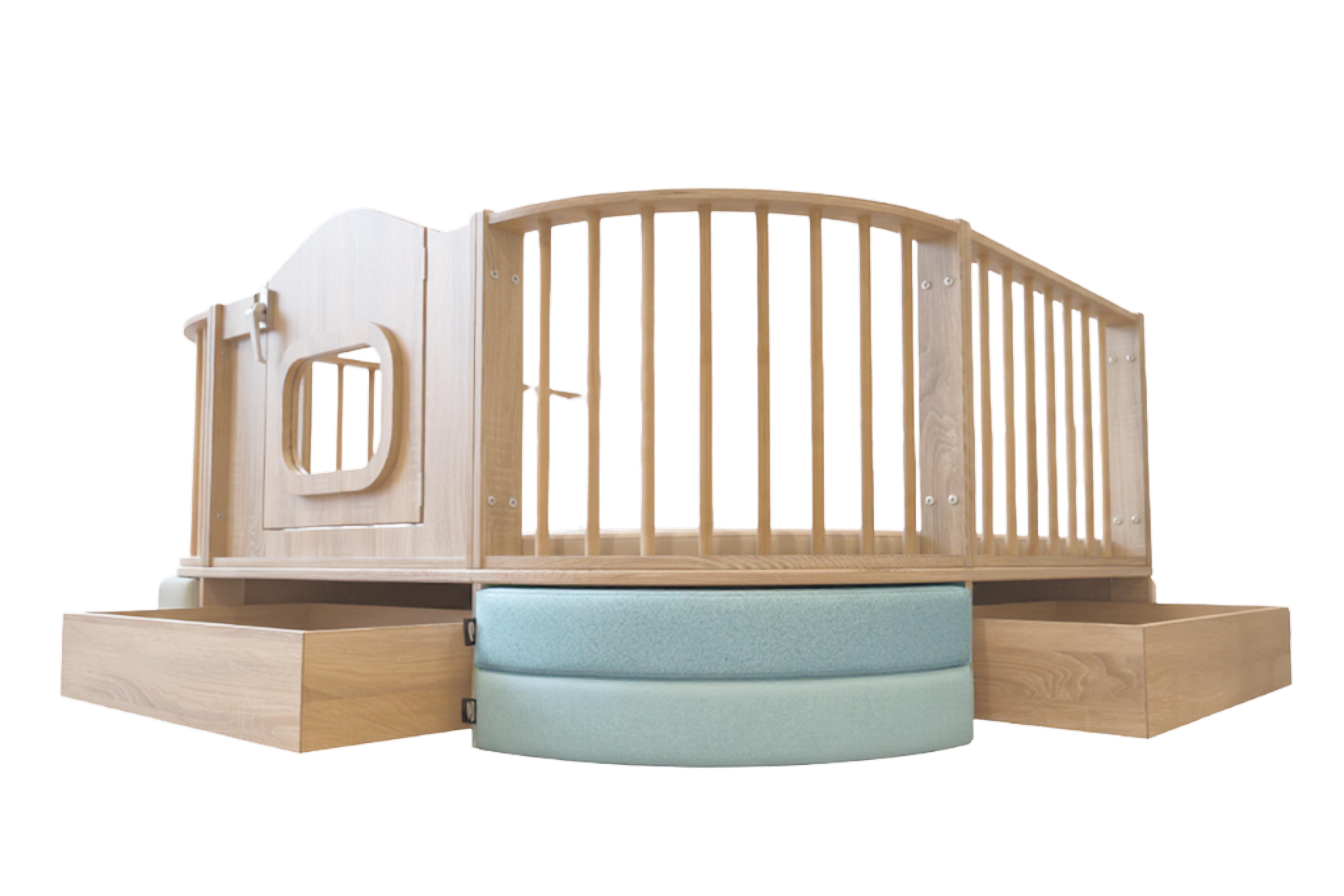 Uitgevoerd met 3 laden met in de hoeken ruimte voor het opberken van speelkussen.