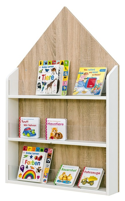 Ruimte voor veel boeken biedt deze plank in eigen huis. Zodat er geen boek kan uitvallen, zijn drie schijven gemaakt van acrylglas bevestigd. De boeken kunnen op een zodanige manier worden gesorteerd dat de hoes zichtbaar is voor de kinderen. Verbonden aan een kind-vriendelijke hoogte, kunnen de kinderen hun favoriete boeken nemen en ze weer opruimen.
