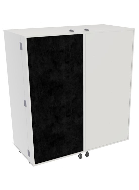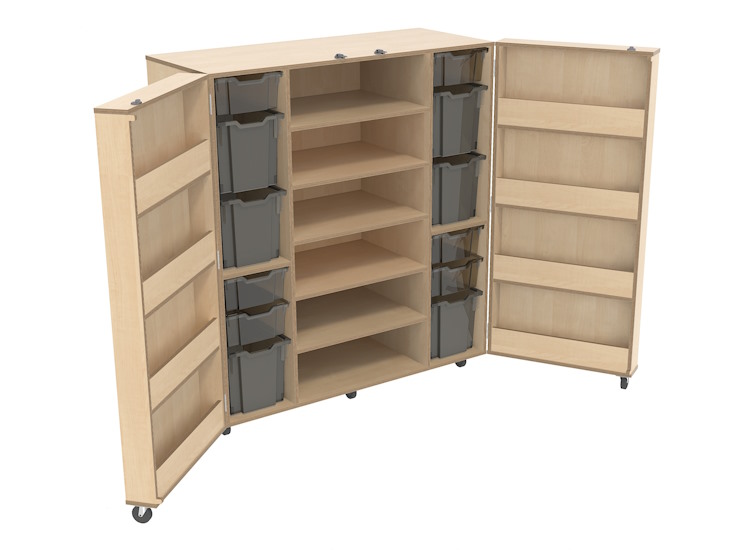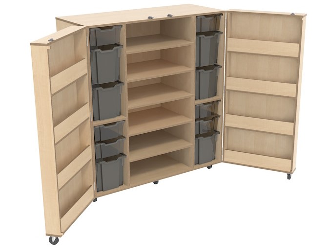 Grote knutselkast volledig berken decor op geremde wielen met deuren.