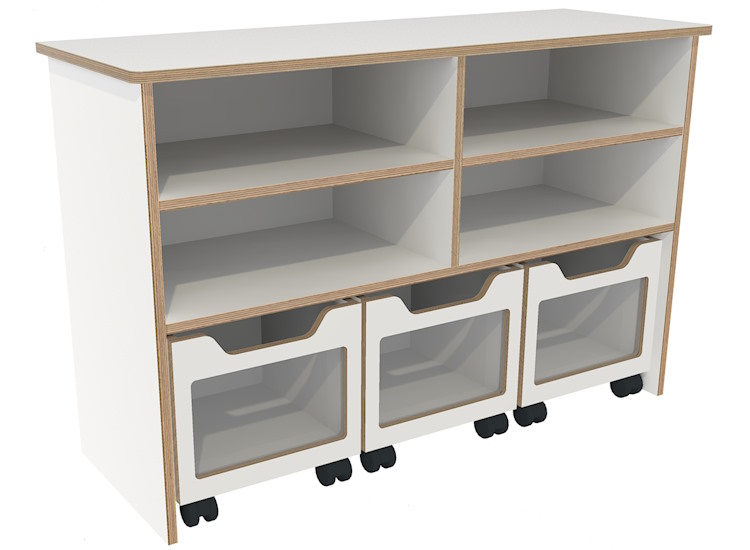 Lage vaste kast met 4 opbergvakken en 3 rolbakken.