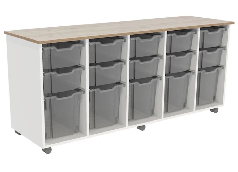 Verrijdbare lage kast met maar liefst 10 medium transparante bakken H15 cm