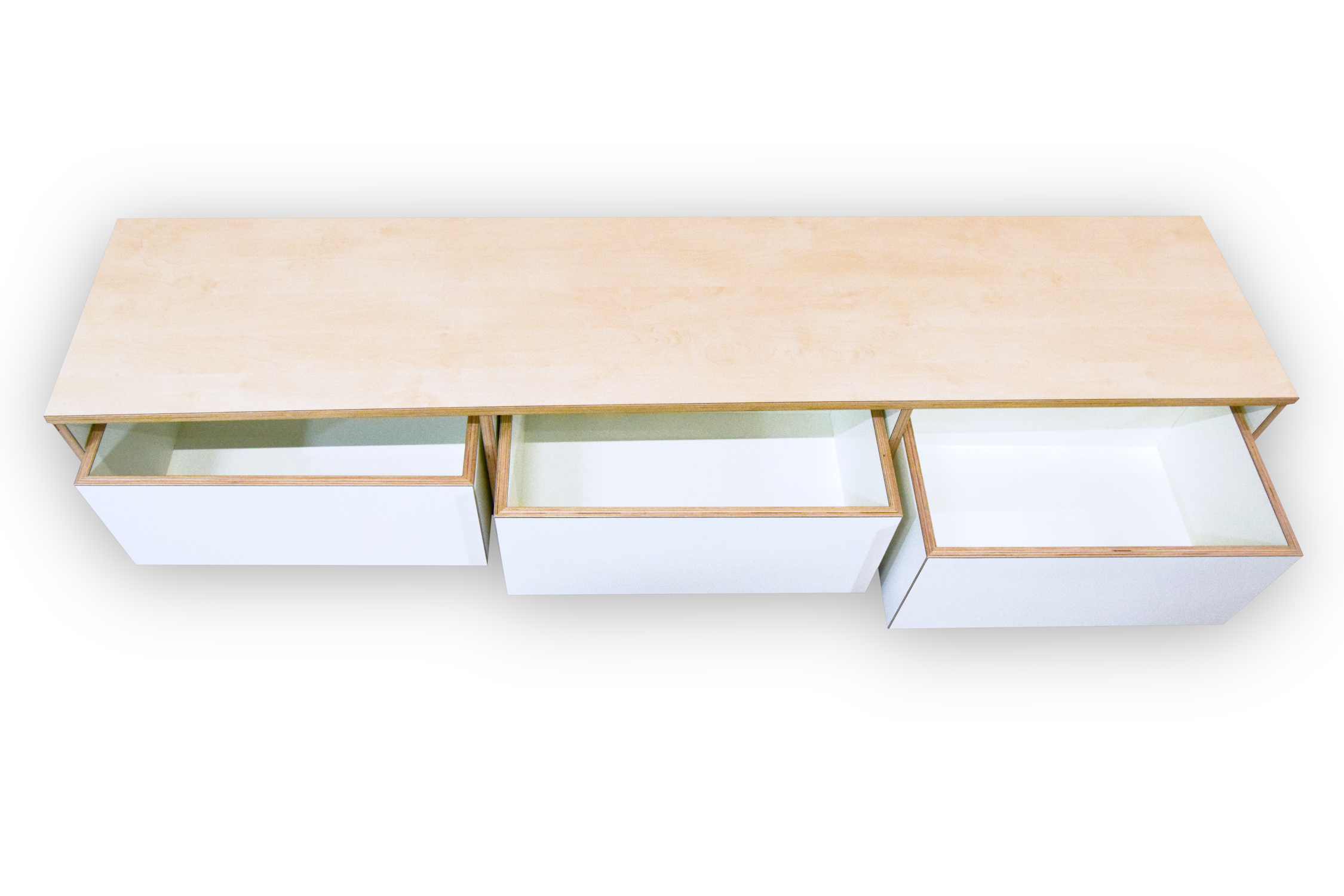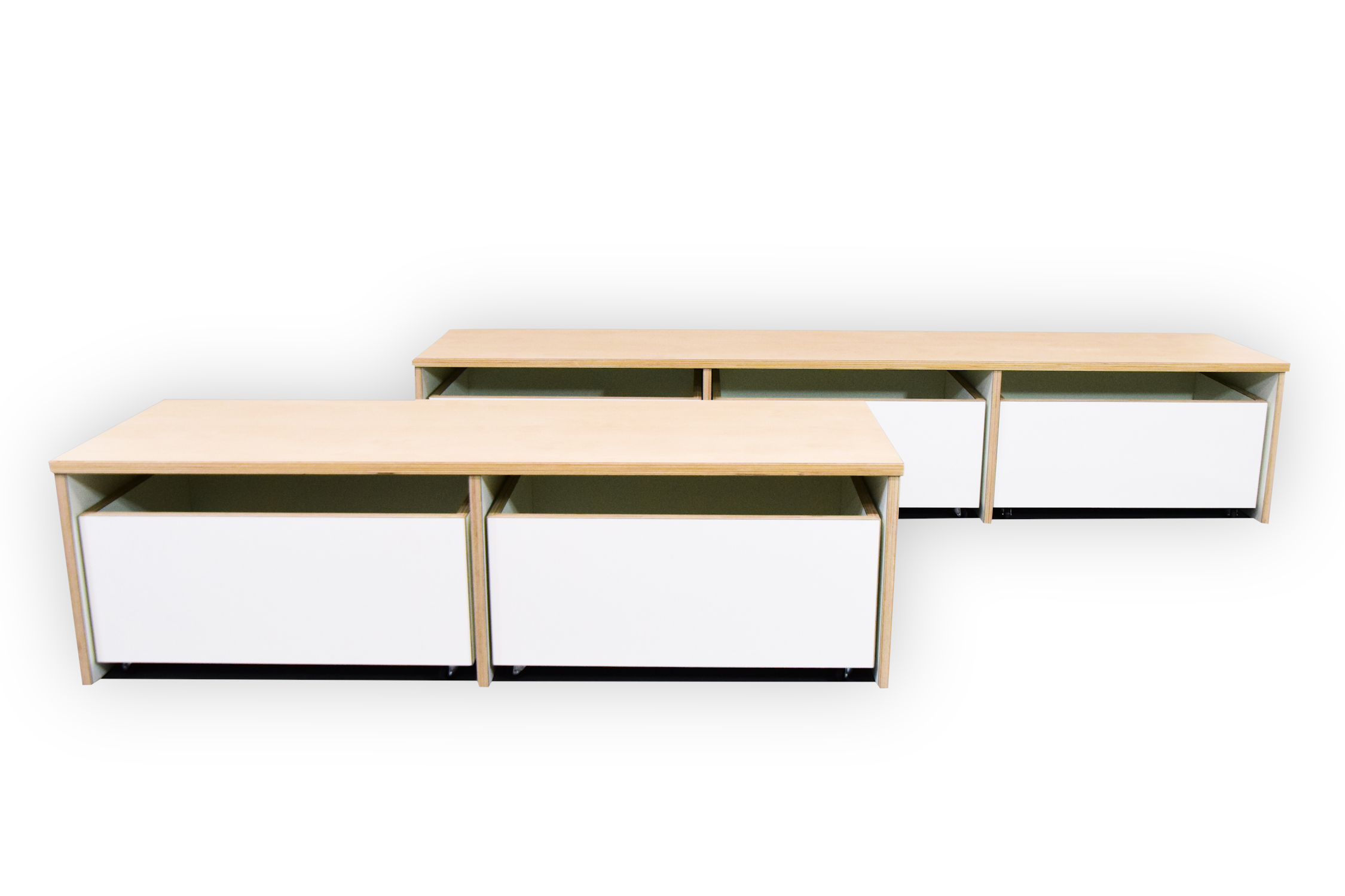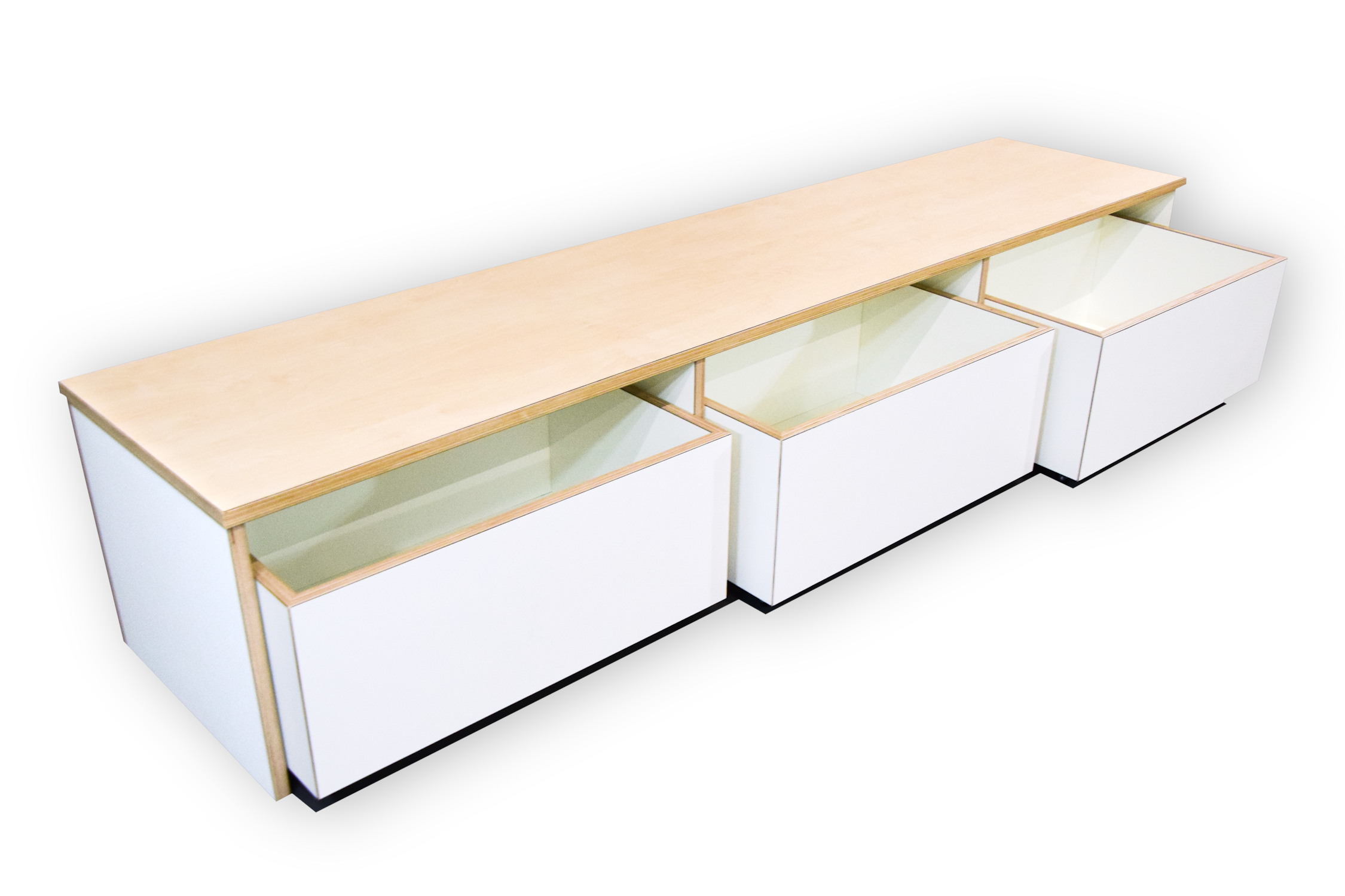 De bank en rolbakken zijn opgebouwd uit 18 mm berken multiplex met witte HPL toplaag.