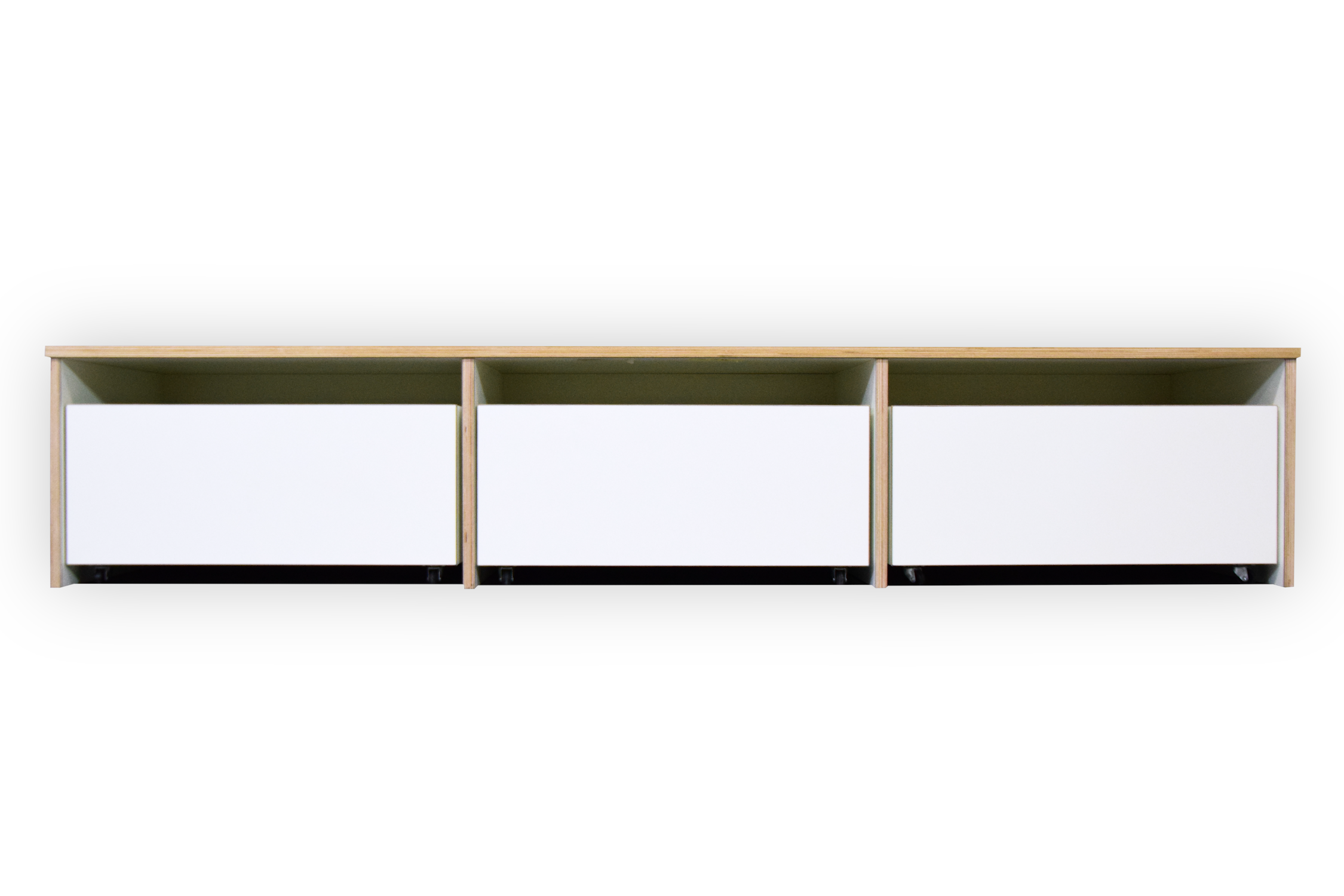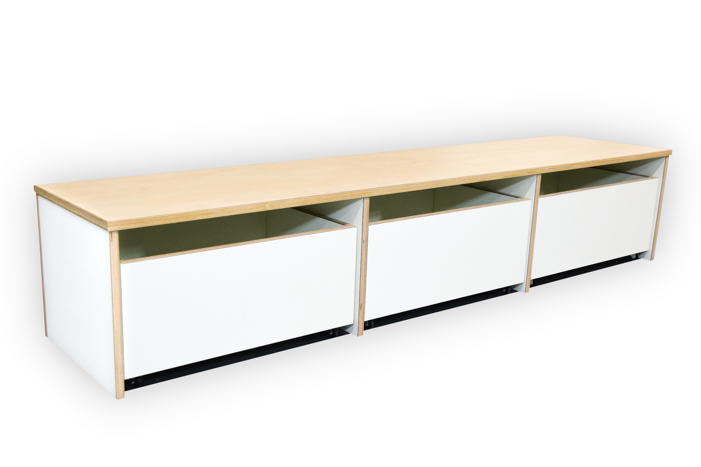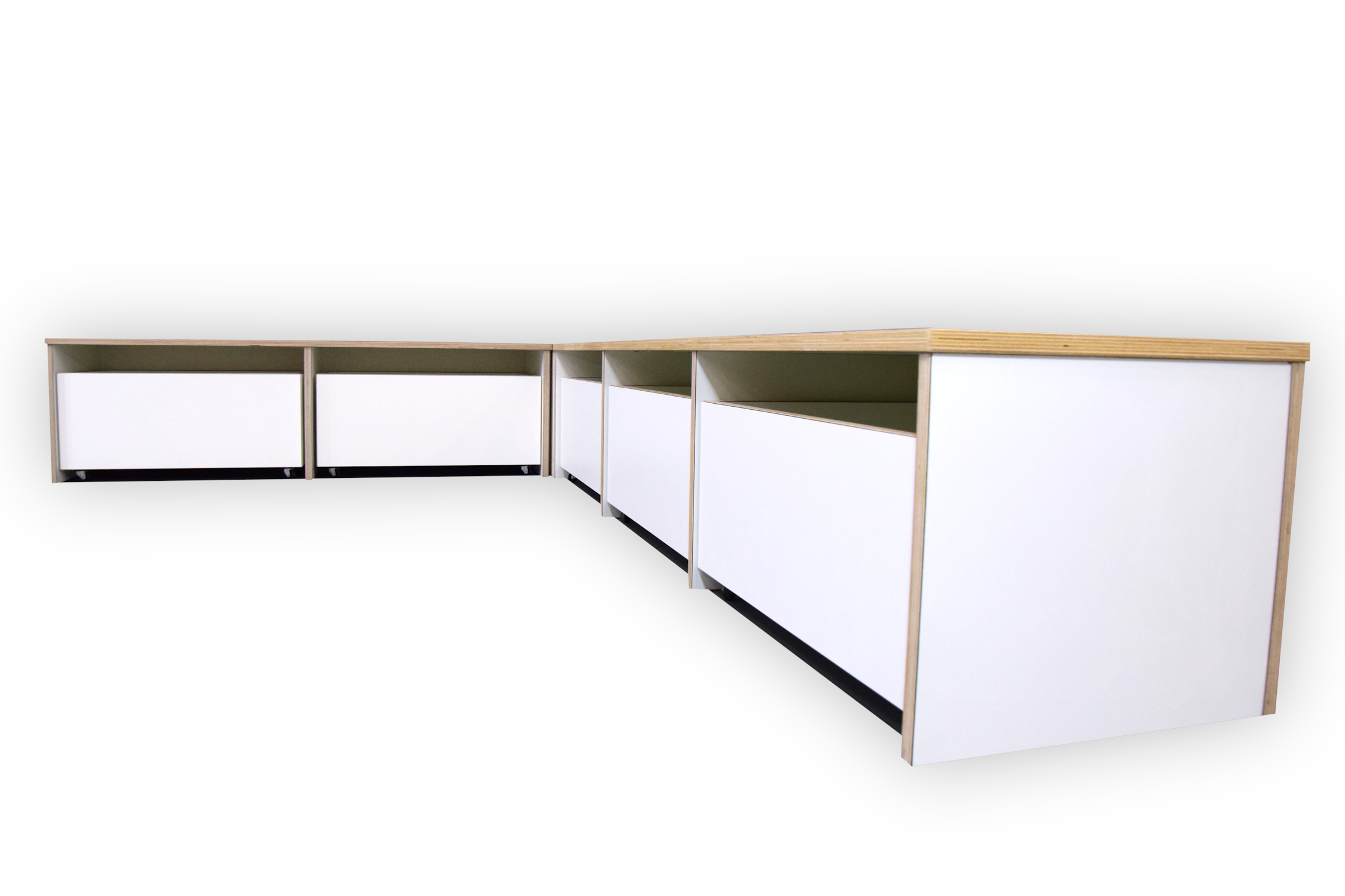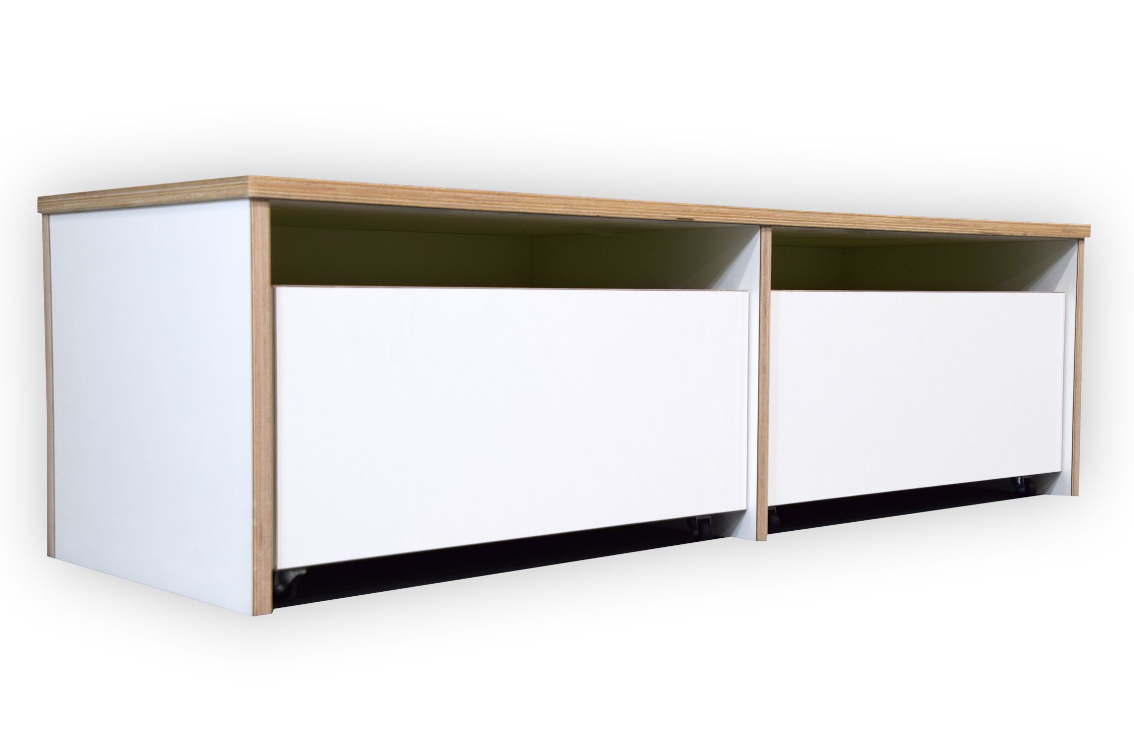 Dit meubel is opgebouwd uit 18 mm berken multiplex met witte HPL toplaag.