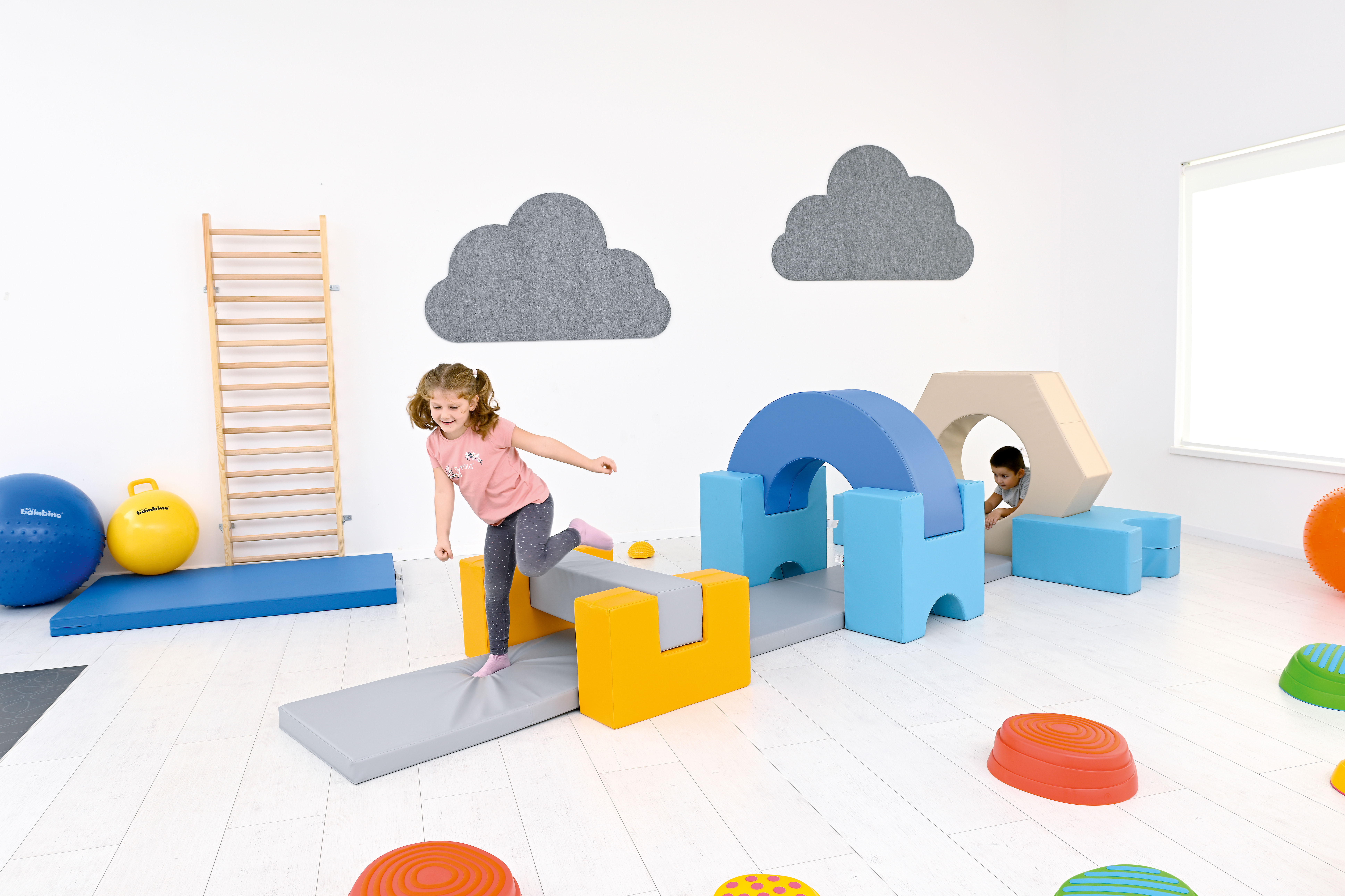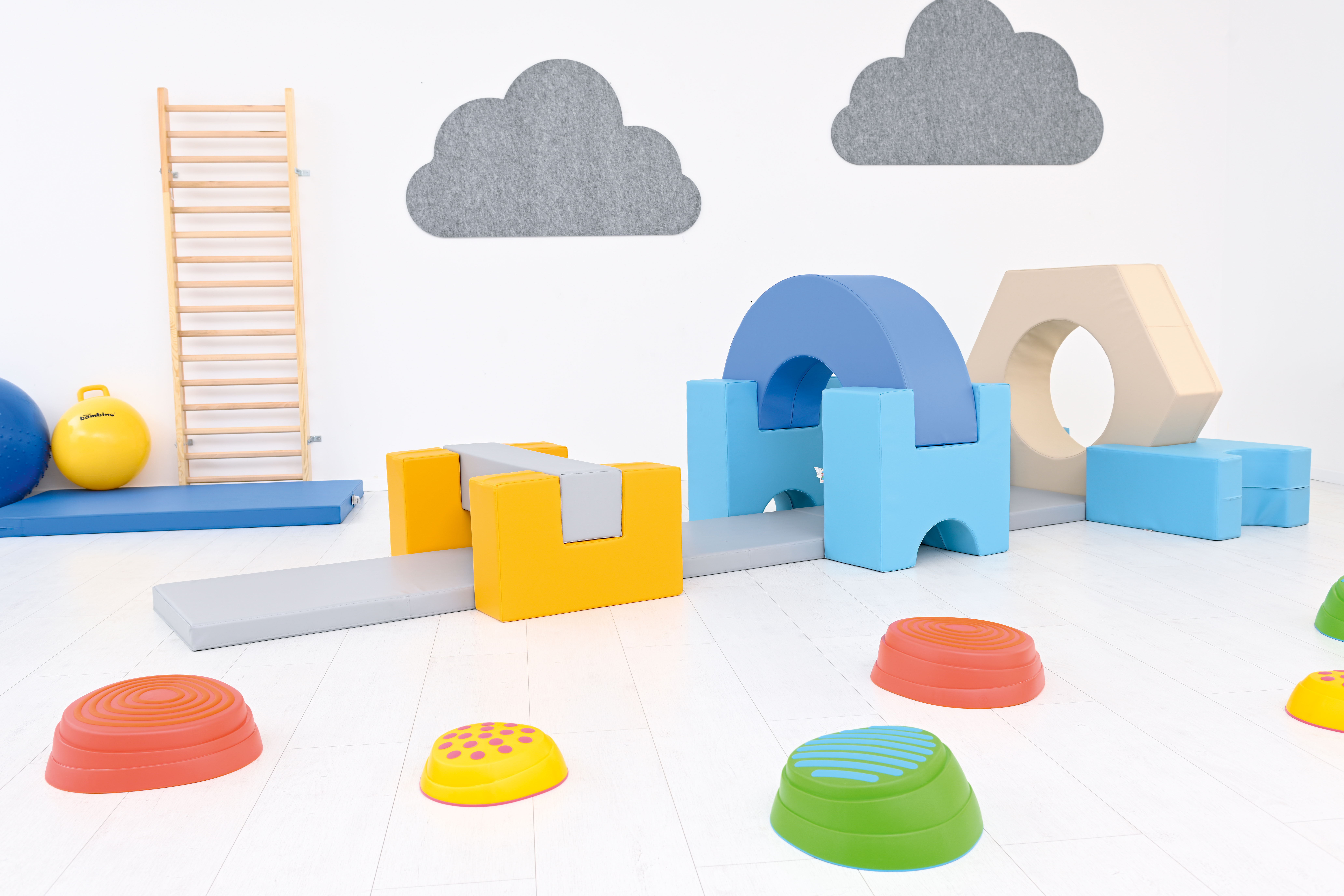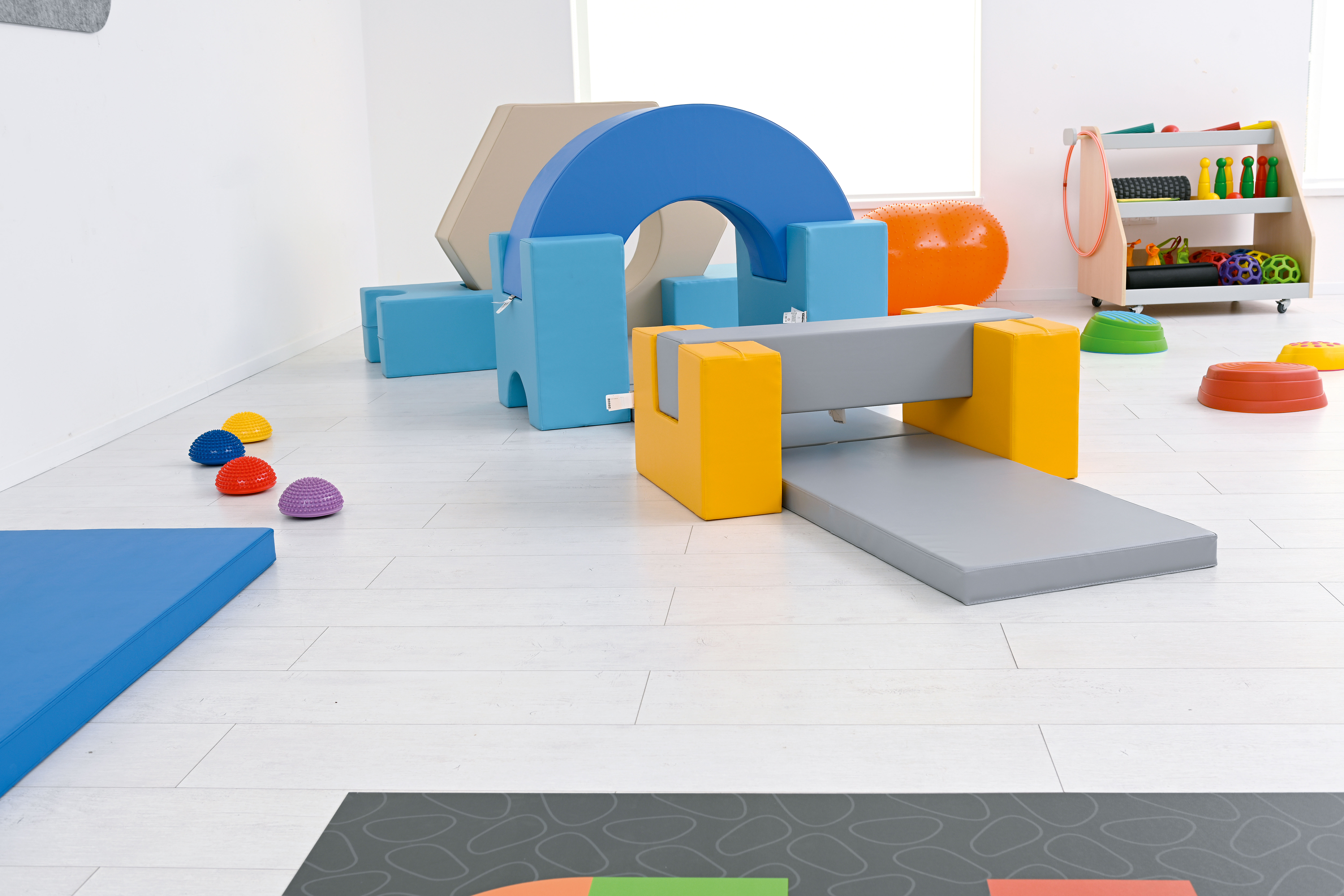 Inhoud: 1 boog, 1 balk, 3 matten, 4 steunen, 2 U-steunen en 1 zeshoekige blok omdoor te kruipen.
