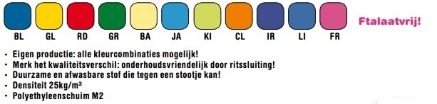 Mogelijke kleuren: banane, blauw, clementine, geel, groen, iris, java, jeans, kiwi, lila, framboos en rood.