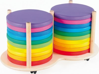 Omschrijving: Ronde zitkussentjes die makkelijk weg te bergen zijn op de bijgeleverde trolley.