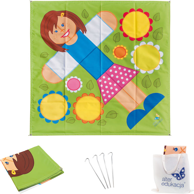 Dankzij de stalen pinnen die aan de set zijn bevestigd en de speciale gaten in het kleed, kan het stevig aan de buitenkant worden bevestigd, bijvoorbeeld op het gras.