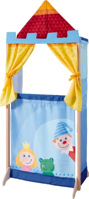 Kleurrijke poppenkast met 2 gordijntjes en 4 lussen voor het ophangen van handpoppen.