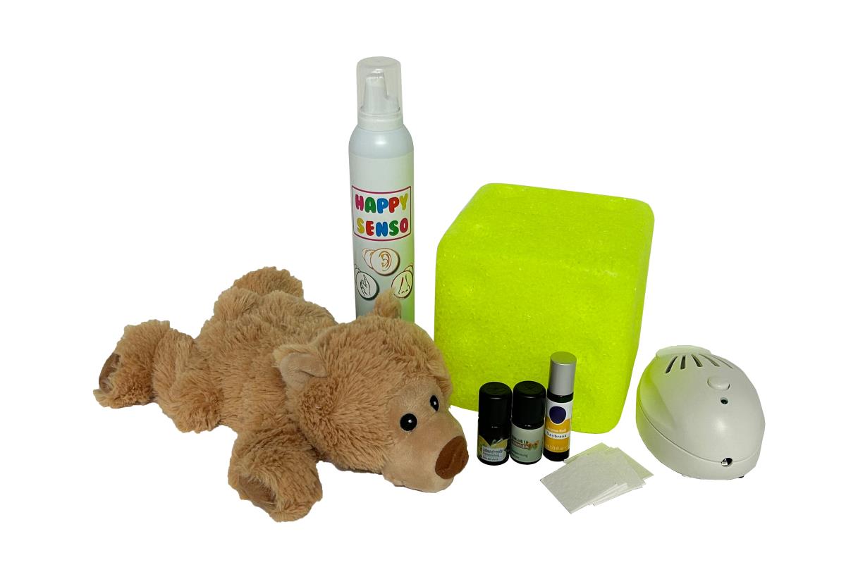 De snoezelset bestaat o.a. uit aromaverspreider, CD en meer diverse aroma artikelen.