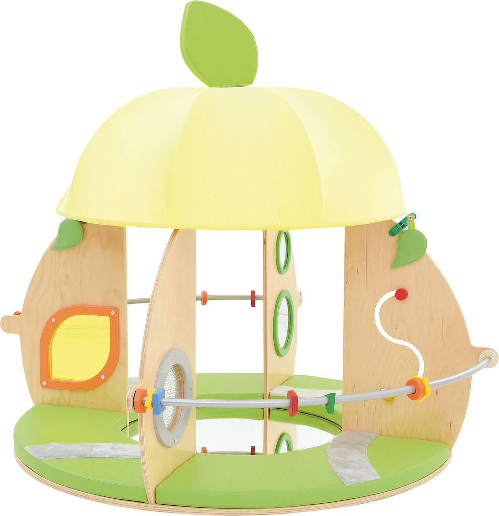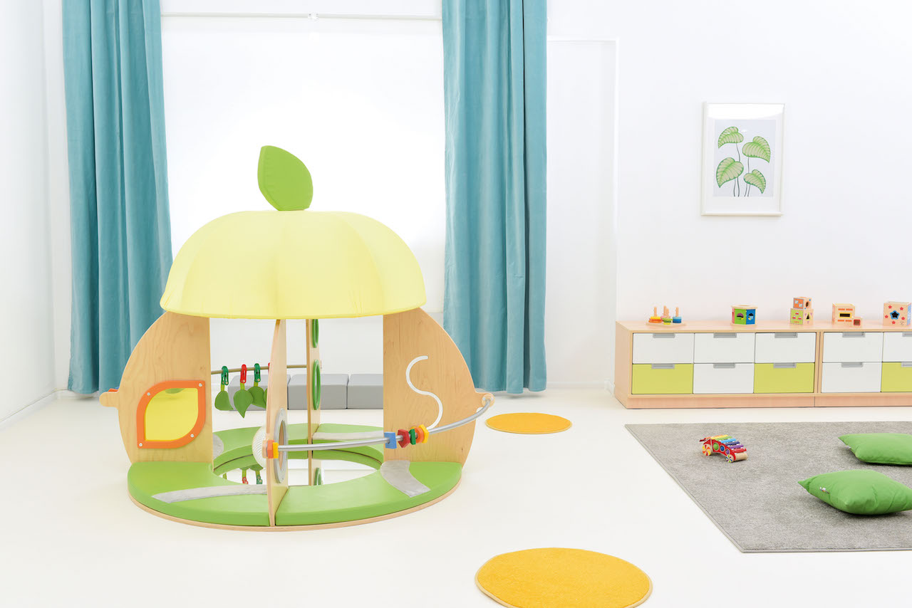 Een rond huisje met een dak, matrassen en een spiegel op de vloer.