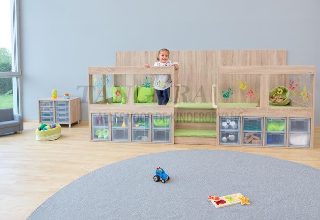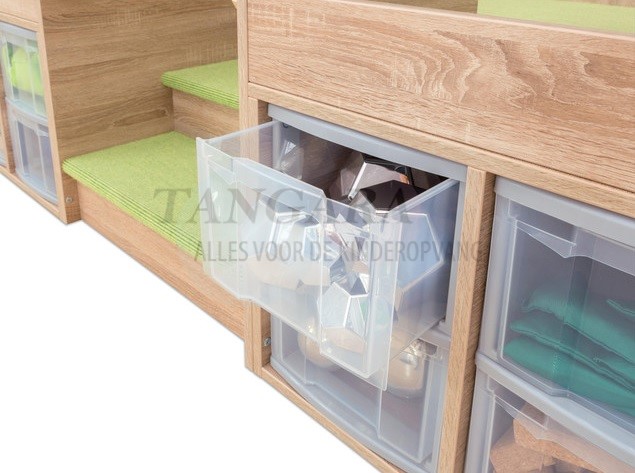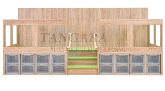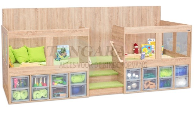 | EduCasa Niveau afspelen en uitvoeren. Groot speelveld en nog meer opbergruimte wonderen! Met 16 grote laden. Veelzijdig. Trap met dubbelzijdige leuning. Veilig plezier voor iedereen! Niet alleen een leuk speeloppervlak, maar ook praktische opslag,dat is het speelniveau van EduCasa. De 16 grote laden bieden genoeg ruimte voor al het speelgoed, boeken en alles dat op zoek is naar een plek. Het bovenstaande niveau biedt veel toepassingen. Of het nu een knuffel- en leeshoek, een poppenhuis of een algemeen speellandschap is, het spelniveau is overal geschikt voor. Een kleine trap met leuning aan beide zijden brengt zelfs de kleinste gemakkelijk omhoog. Het gehele niveau is voorzien van tapijt en biedt comfort in het dagelijks leven. Door de ramen rondom kunnen de kinderen kunnen observeren wat er in de rest van de kamer gebeurt, maar ook de kleuterleidsters hebben een beter zicht door de ramen. Voor zelf-assemblage. Afmetingen (H x B x D): 146,7 x 330 x 116,9 cm. Tretford-tapijt: bevat niet-textiele delen van dierlijke oorsprong, natuurlijke vezels bestaande uit 80% geitenhaar en 20% zuivere scheerwol. |