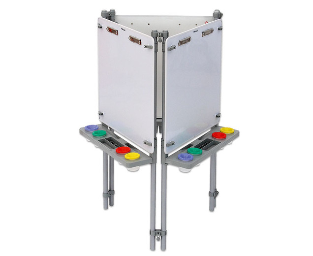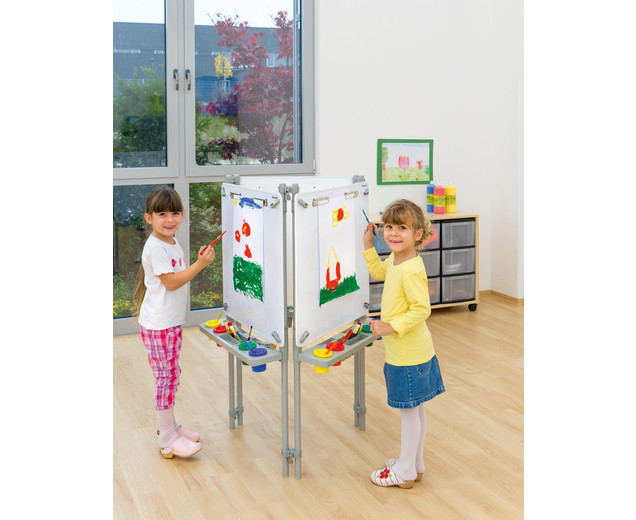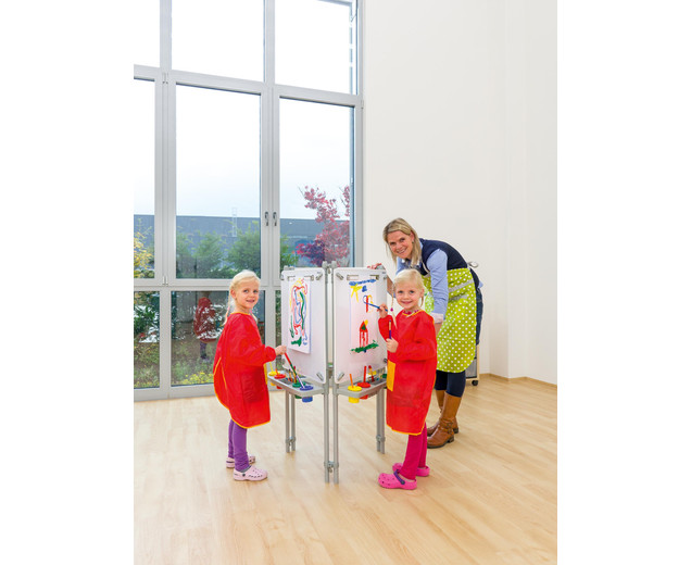 | schilders ezel 3 zijdig Hier ontstaan ​​kunstwerken hoogte verstelbaar met verfbekers inclusief montage-instructies In hoogte verstelbare schildermuur voor uw faciliteit Wie wordt de nieuwe Picasso? Drie tot zes kinderen kunnen tegelijkertijd hun ideeën op papier zetten op de 116 cm hoge schilderijmuur. Ze kunnen ideeën uitwisselen en van elkaar leren. Elk kind werkt op zijn eigen schilderijoppervlak van 60,5x60,5 cm, dat is voorzien van vier verfpotten en een penseelsteun . Dit is afneembaar en kan in de vaatwasser worden gereinigd. De hoogte van elk schilderijoppervlak kan individueel worden aangepast aan de grootte van elk kind . Gebruik de verfmuur met de volgende eigenschappen: - Verfmuren zijn magnetischen kan worden geverfd met whiteboardmarkeringen en weer worden afgeveegd - elke verfmuur heeft twee clips om op papier te houden. - Onder elk verfoppervlak bevindt zich een verwijderbaar inzetstuk voor vier verfbekers en opbergruimte voor penselen, pennen, etc. Afmetingen (L x B x H): 58 x 8,5 x 7,5 cm - Totaal metalen frame: 116 cm hoog - Afmetingen het verfoppervlak: 60,5 x 60,5 cm - het complete verfbord is in hoogte verstelbaar - inclusief water- en veiligheidskleurbekers; vier stuks per oppervlak - eenvoudig schroefmechanisme om de hoogte aan te passen en een verlenging te maken - naar wens uit te breiden - met montage-instructies Details: - Frame: aluminium - Panelen: MDF, gecoat en rubberen randen - Kleine onderdelen: polypropyleen (PP) levering - 3-zijdige schildermuur, incl. 12 verfbekers; Afmetingen: 116 x 67 x 58 cm Gegevens & feiten te gebruiken: Leeftijd vanaf:2 jaar textuur: Primair materiaal:plasticAndere materialen:metaal Afmetingen / gewicht: diepte:58 cmbreedte:67 cmheight:116 cm Algemene info: Product kleur:Wit, zilver, metaalachtig |