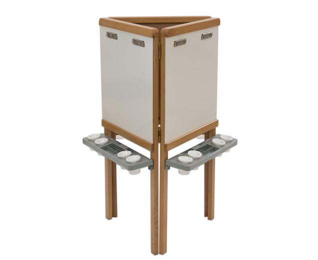| 3-zijdige schildermuur van hout voor drie kinderen met afneembare lade Whiteboard, schoolbord en schildermuur Klem het papier vast - klaar! Dit model is gewoon ingenieus en super doordacht - de 3-zijdige schildermuur is bij uitstek geschikt voor kinderen tussen 3 en 10 jaar. Drie kinderen kunnen tegelijkertijd creatief worden op een werkhoogte van 55 cm. Door de verschillende oppervlakken, zoals whiteboard en magnetisch bordoppervlak , kunnen kinderen ervaring opdoen met verschillende soorten applicatietools (idealiter krijtbord- en whiteboardmarkers) en creatief worden op papier met vingerverf op een oppervlak van ongeveer 60 x 60 cm . Metalen connectoren verbinden eenvoudig de drie zijden met elkaar. Het whiteboard-paneel kan door de schuifstrip uit het frame worden verwijderd en heeft 2 aansluitstrips per oppervlak voor het bevestigen van papier . Het praktische dienblad kan worden verwijderd en in de vaatwasser worden gereinigd. Het wordt gebruikt om 4 verfpotten op te slaan incl. Dop , borstels, pennen en meer Details: Afmetingen (H x B x D): 15 x 60 x 60 cm Materiaal: hout, MDF, kunststof Gewicht: 18 kg Hoogte onderrand Verfoppervlak: 55 cm levering - 3-zijdige schildermuur - 3 kleurenladen - 12 kleurenbekers met dop - Montage- instructies - Bevestigingsmateriaal Gegevens & feiten te gebruiken: Leeftijd vanaf:3 jaar textuur: Primair materiaal:houtAndere materialen:Kunststof, metaal, MDF Afmetingen / gewicht: diepte:60 cmbreedte:60 cmheight:115 cm |