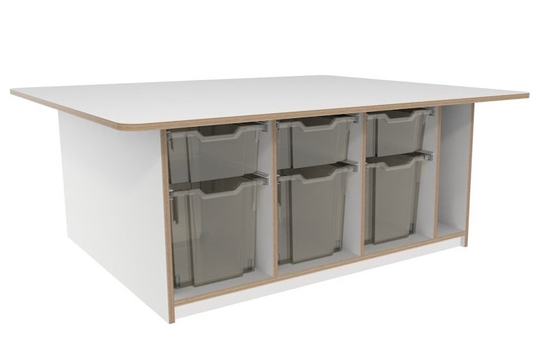 Grote bouwtafel voorzien van 6 grote H30 en 6 mediumgrote H15 transparante lades verdeeld aan beide kanten,