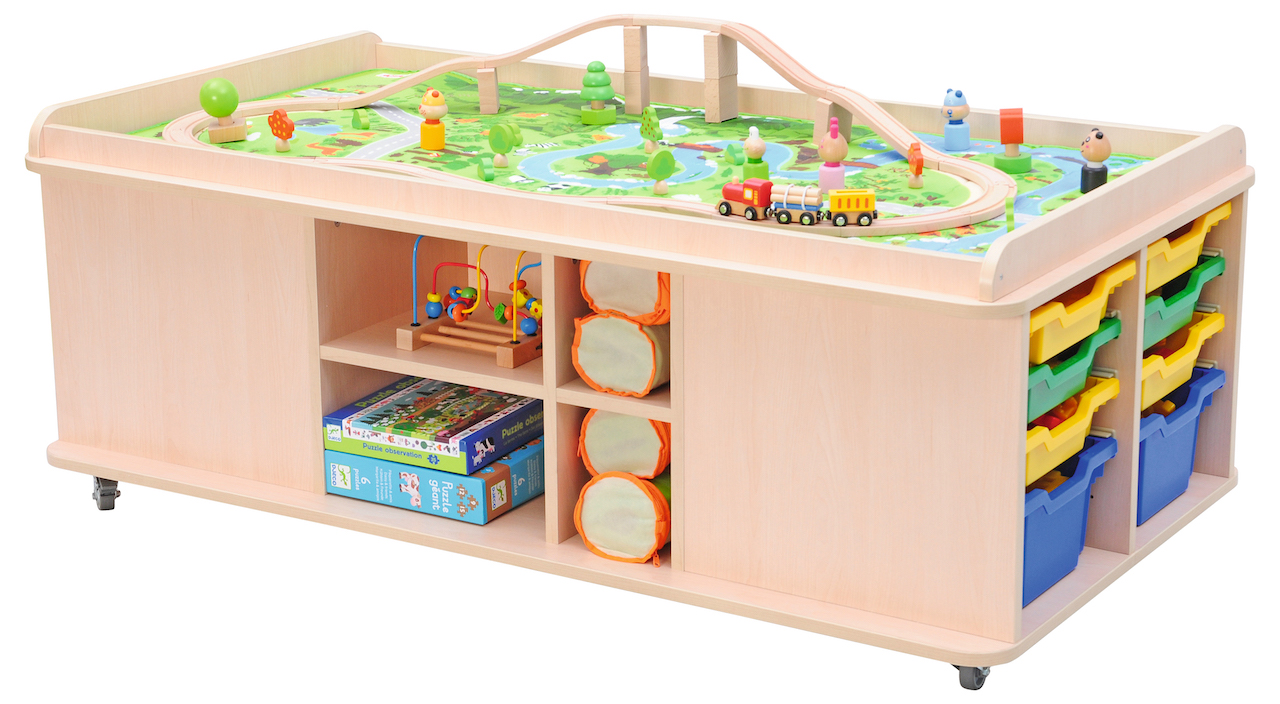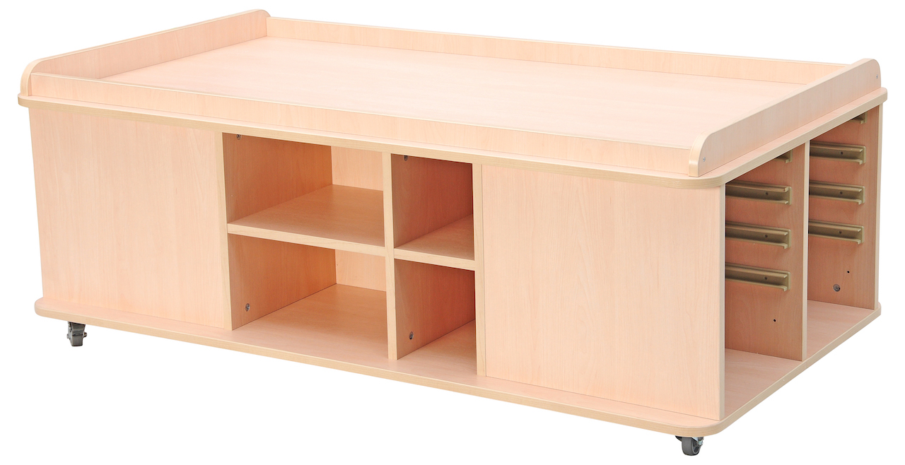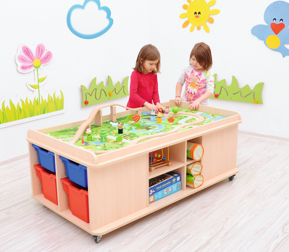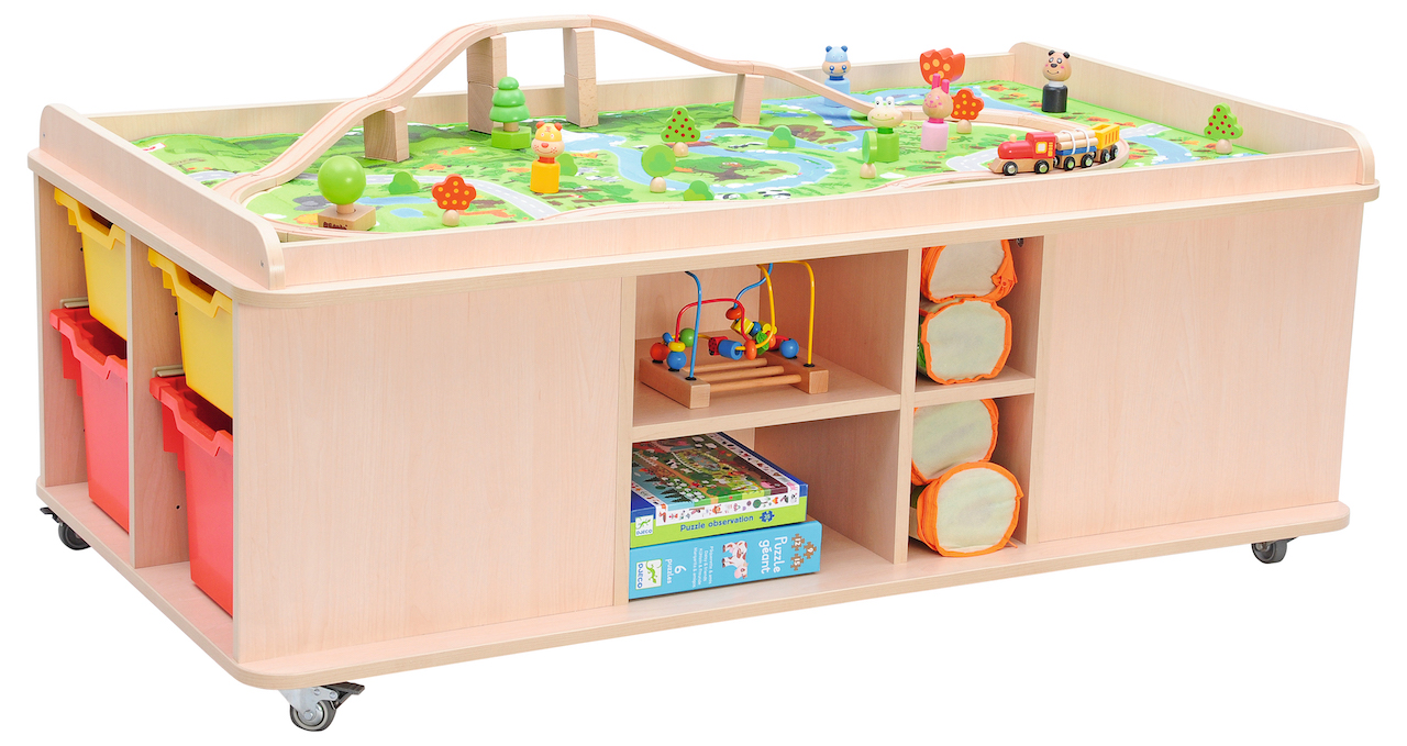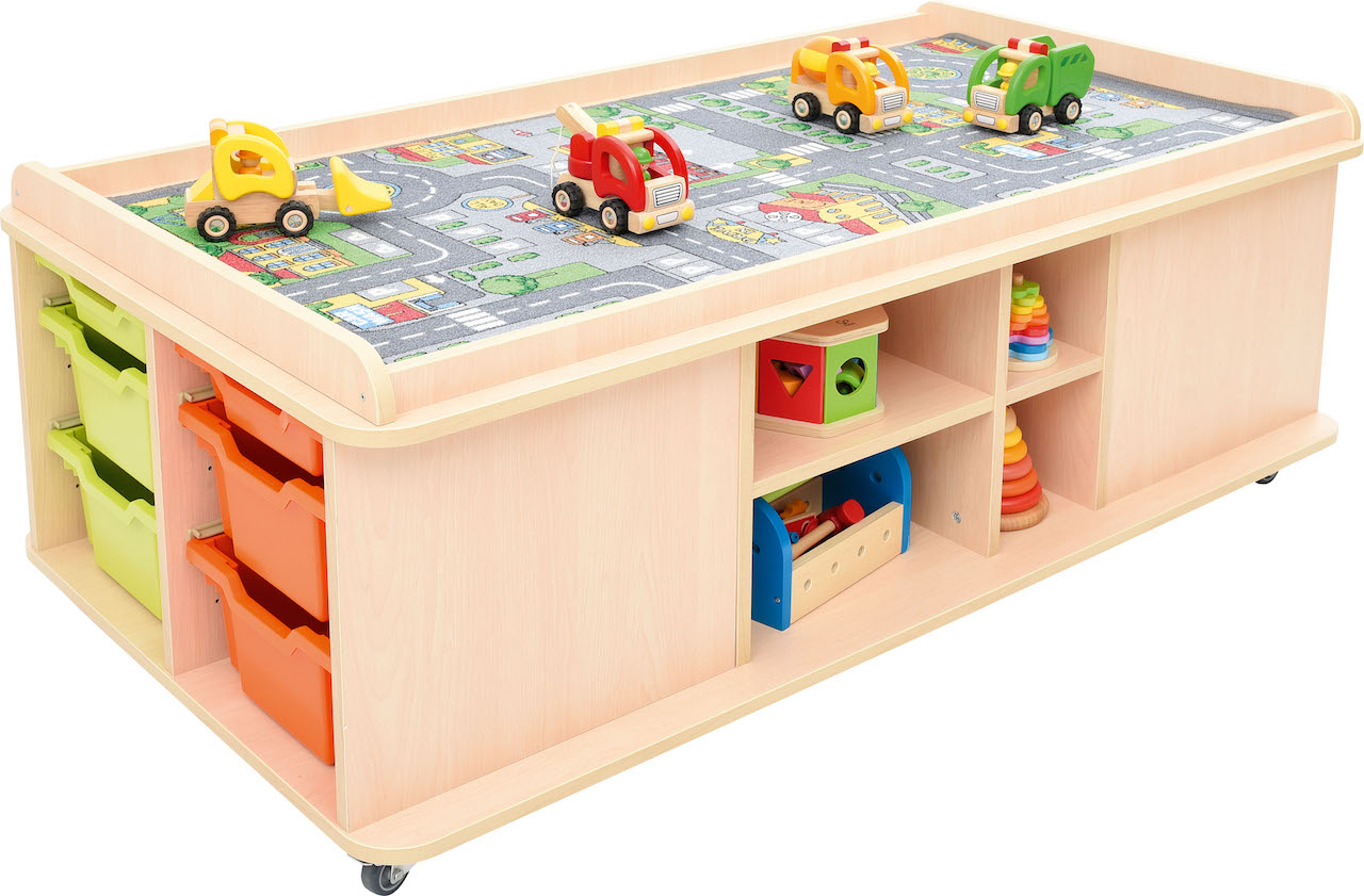Speeltafel voorzien van legplanken en nissen voor het opbergen van speelmatten.