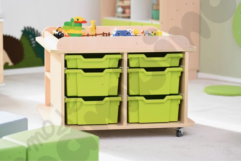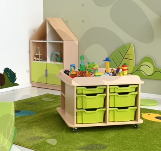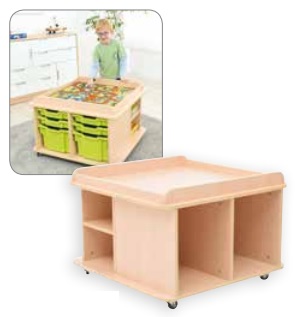 Speeltafel voorzien van legplanken en nissen voor het opbergen van speelmatten.