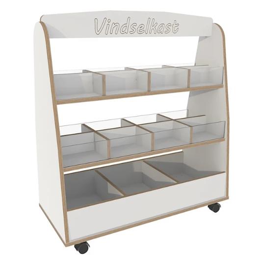 Verrijdbare kast om allerlei gevonden materiaal of 'loose parts' tentoon te stellen.