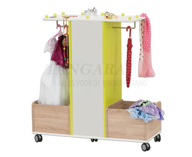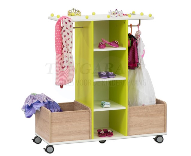 De mobile garderobe biedt veel ruimte voor kostuums, hoeden en jurken van allerlei soorten. In de grote spiegel kunnen de kinderen hun outfits bekijken en hun laatste hand leggen met behulp van accessoires. Dankzij de wielen kan de kast gemakkelijk worden verplaatst van A naar B. De remmen zorgen voor een stevige houvast De kledingkast biedt een open toegang tot kleding en accessoires en overtuigt met zijn vele opbergmogelijkheden (groot hoedenrek, plank met 4 opbergvakken, 2 opbergdozen, grote spiegel, 2 kledingstangen). Dit product wordt ongemonteerd geleverd en hierop is zelfmontage van toepassing.. |