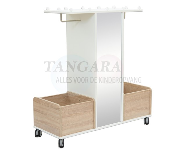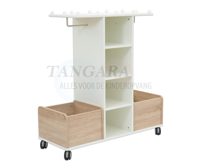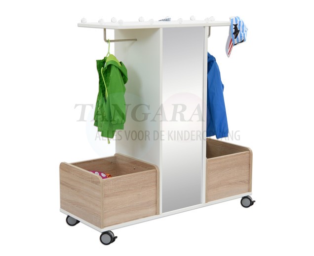 De mobiele garderobe biedt veel ruimte voor kostuums, hoeden en jurken van allerlei soorten. In de grote spiegel kunnen de kinderen hun outfits bekijken en hun laatste hand leggen met behulp van accessoires. Dankzij de wielen kan de kast gemakkelijk worden verplaatst van A naar B. De remmen zorgen voor een stevige houvast De kledingkast biedt een open toegang tot kleding en accessoires en overtuigt met zijn vele opbergmogelijkheden (groot hoedenrek, plank met 4 opbergvakken, 2 opbergdozen, grote spiegel, 2 kledingstangen). Dit product wordt ongemonteerd geleverd en hierop is zelfmontage van toepassing.. |