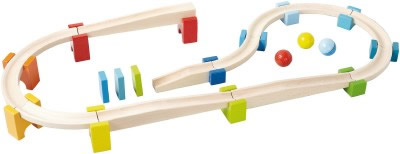 Inhoud: 4 rampen, 8 bochten, 12 gekleurde verbindingsblokken, 3 dominoblokjes en3 effectballen.