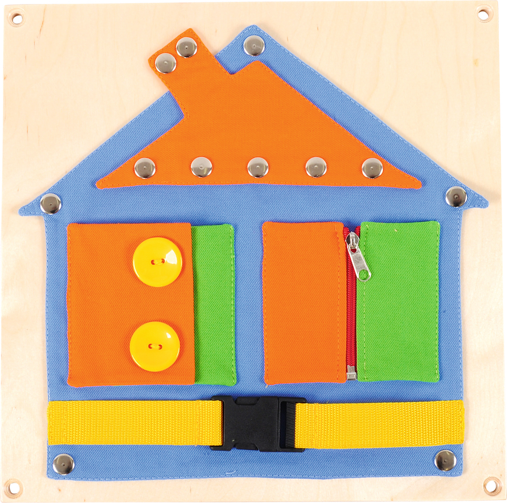 Afmeting: 35 x 35 cm Met verschillende soorten bevestigingen op het huis kunt u uw vingers oefenen en leert u de basisvaardigheden die nodig zijn bij het aankleden.