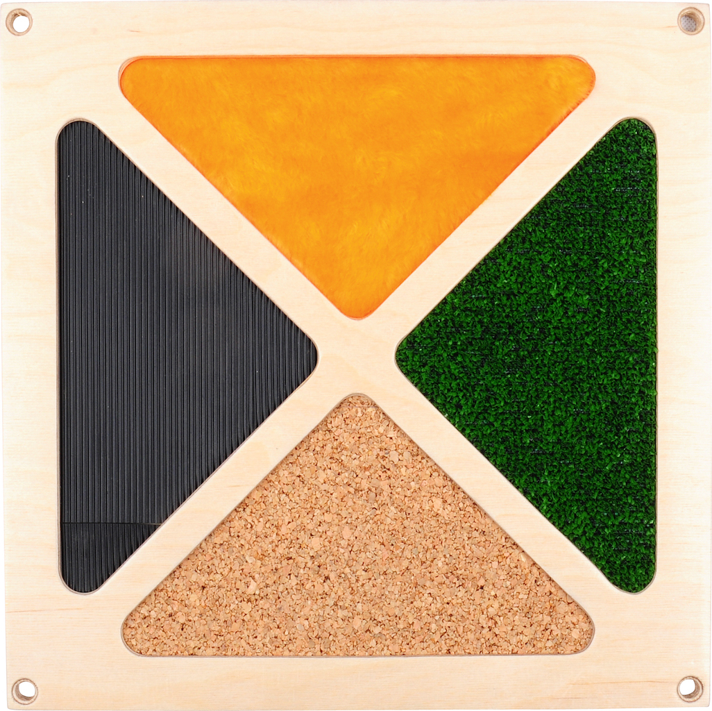 Decoratieve elementen van multiplex met verschillende motieven die kinderen zullen stimuleren om te spelen, observeren en ervaren door aanraking.