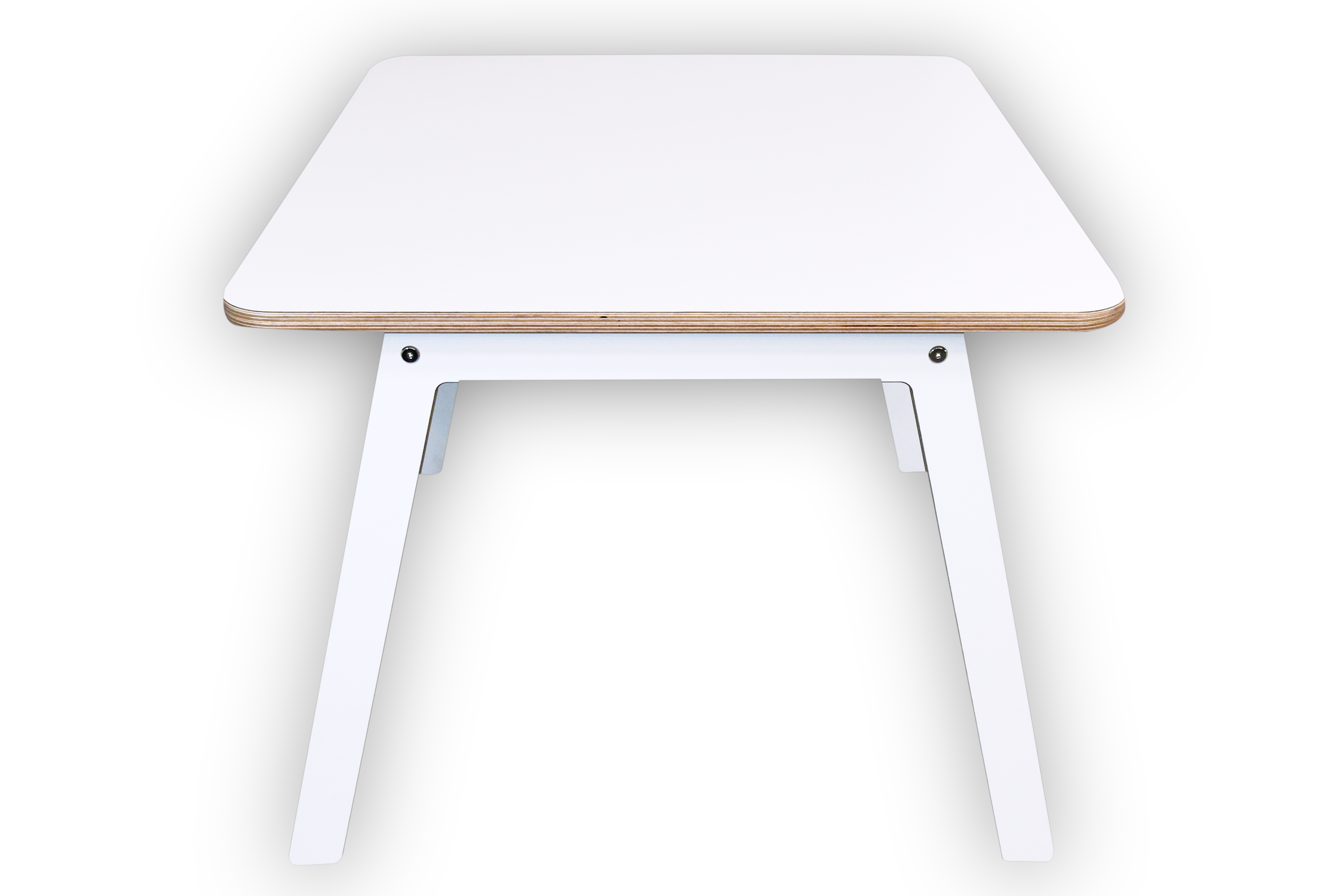 De kindertafel is opgebouwd uit 18 mm berken multiplex met witte HPL toplaag.