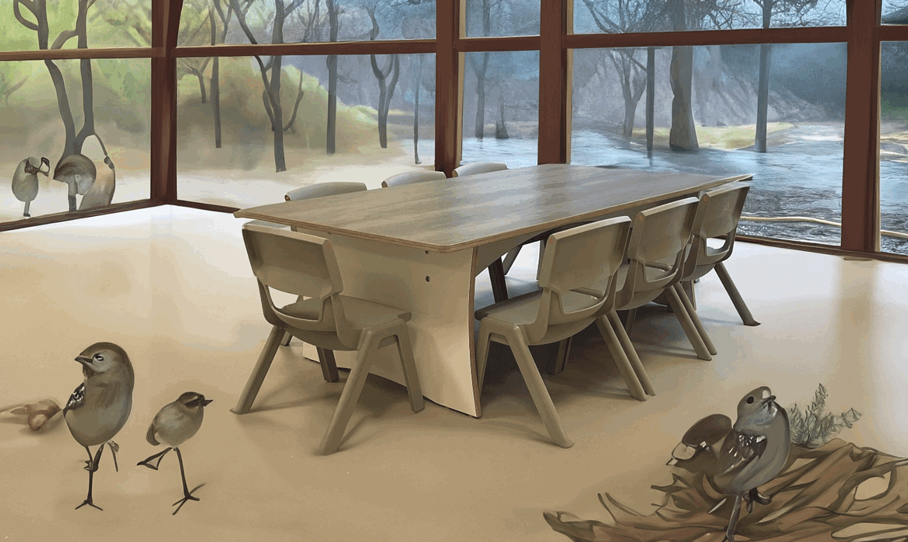 De instructietafels zijn opgebouwd uit 18 mm berken multiplex