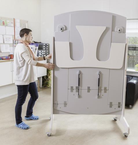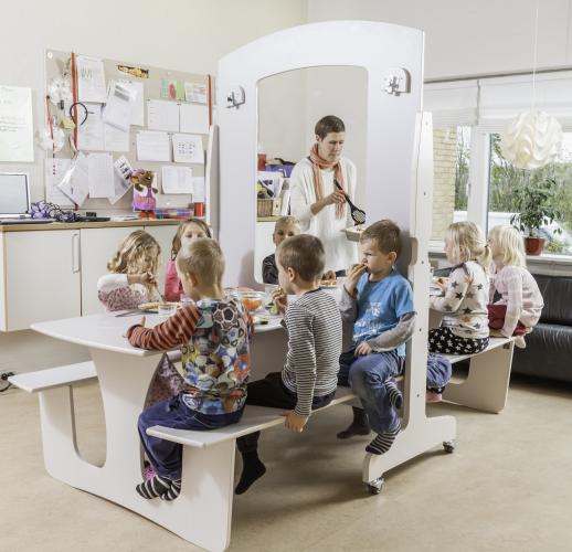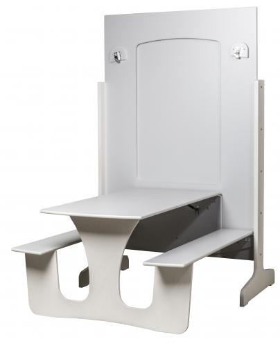 | 2 klaptafels die worden opgeklapt tegen het scheidingswand in het midden. Dubbelwandige klaptafel inclusief geïntegreerde banken op zijn eigen verwijderbare muur. Een snelle, elegante oplossing om 12 zitplaatsen te creëren. De tafel staat op 4 wielen, dus hij kan gemakkelijk worden opgevouwen en opgerold wanneer hij niet in gebruik is. Ruimtebesparend z. B. tijdens het spelen en schoonmaken. De tafel is gemaakt van 18 mm wit gepigmenteerd berken multiplex met lichtgrijs duurzaam laminaat op de tafel en banken, tegen een meerprijs zijn andere kleuren leverbaar. Geleverd met gasdempers die het gemakkelijker maken om de tafel omhoog en omlaag te brengen. Gewicht: 87 kg  |