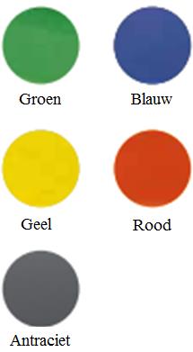 De zitjes zijn verkrijgbaar in 5 kleuren: Rood, Geel, Groen, Blauw en Antraciet.