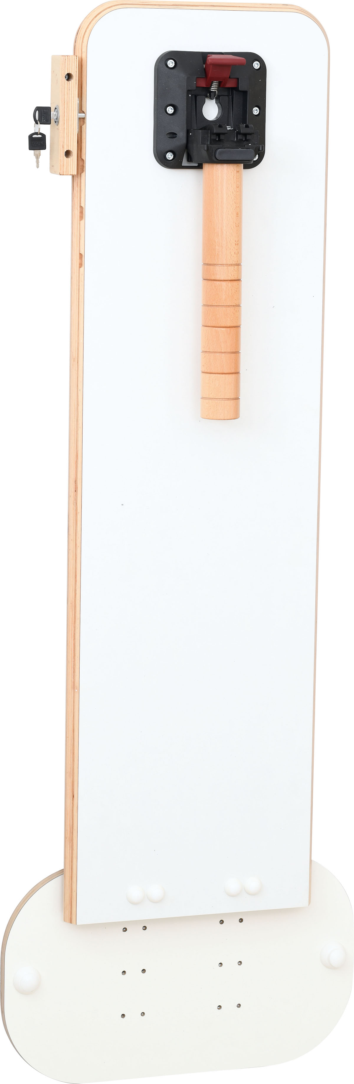 De ronde houten poot is in hoogte verstelbaar.