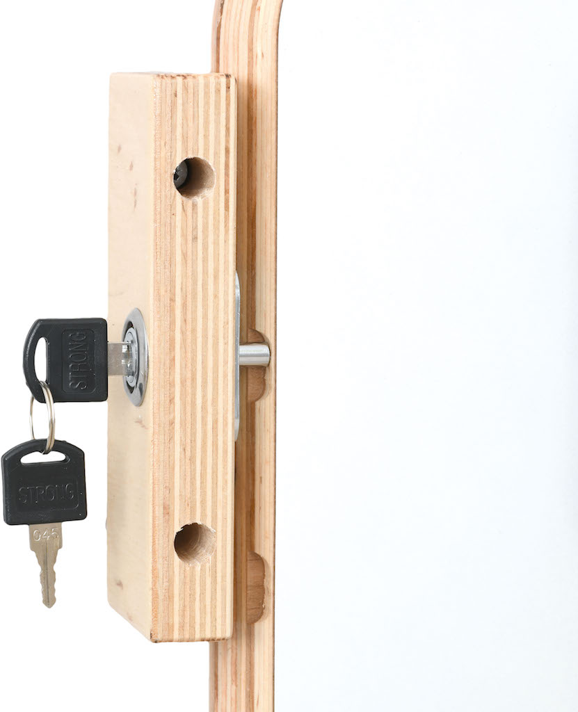 De bank wordt plat aan de muur gemonteerd en klapt indien nodig uit, de poot wordt vergrendeld met een grendel.