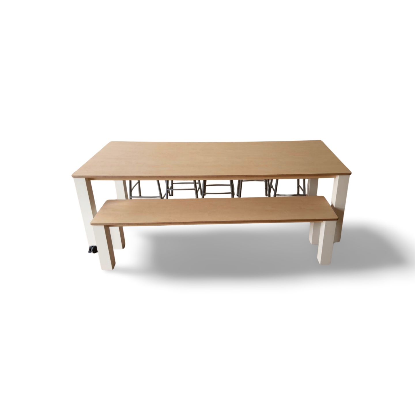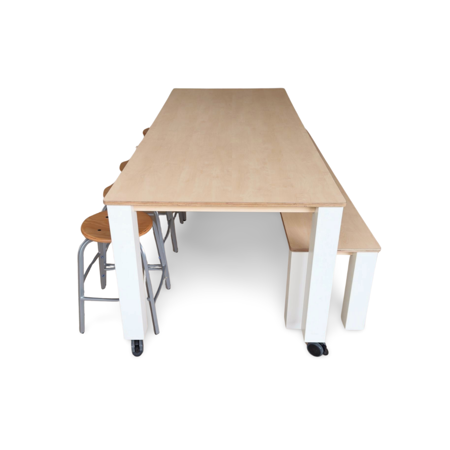 Robuuste bank L135 x B40 cm met rechte massief houten poten. Leverbaar in alle hoogtes. Het zitpaneel wordt standaard uitgevoerd in berken multiplex met een witte HPL toplaag. Onder de robuuste bank zijn massief houten poten gemonteerd. Robuuste bank L135 past tussen de poten van robuuste tafel 160 cm. |
