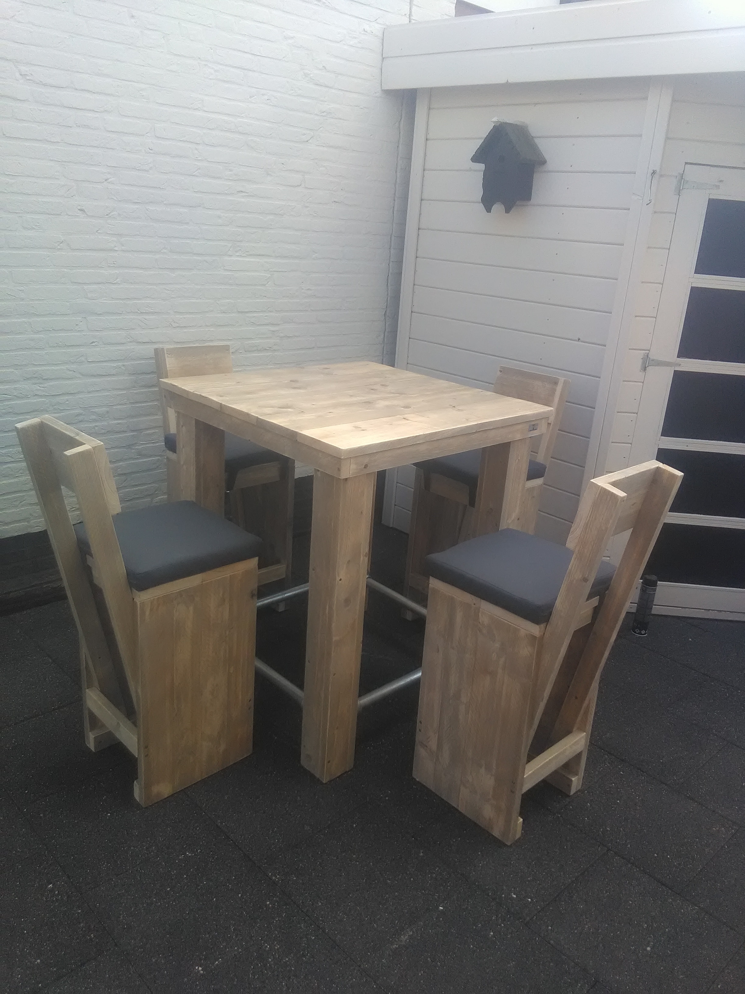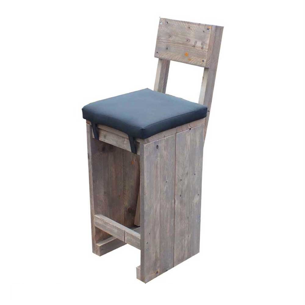 | Steigerhouten Barkruk Enjoy met rugleuning Ook los te bestellen van de (Bar-Set) Enjoy  Kenmerken: Gemaakt van Old-Look steigerhout. Geschuurde planken, geen splinters of ruwe oppervlakken en stofvrij Kussens in verschillende kleuren optioneel verkrijgbaar bij Kussens? Afmetingen: L 40 x D 40 x H 70 cm (met optioneel zitkussen is de hoogte 75cm) Afmetingen optioneel krukkussen: 40x40cm de dikte is 5cm. Krukkussens Onze Krukkussens zijn 5cm dik en worden standaard voorzien van linten, waarom doen wij dat? Meestal als iemand op een kruk gaat zitten dan schuift het kussen van de kruk af, wij vinden dat niet fijn, vandaar dat wij deze linten ook nog voorzien van een klittenband, zo kan deze zeer handig vast gemaakt worden aan de zitting van de kruk en kunt u makkelijker gaan zitten zonder dat de kussen van de kruk afglijd. En daarbij nog een klein ander voordeel, zo kan het kussen ook niet wegwaaien! Ook leuk om te doen: U kunt bijvoorbeeld bij de Bar-Set Enjoy ook 4 verschillende soorten kleuren krukkussens nemen voor een leuk speels effect. Hoe dan? Geef na de bestelling van de krukkussens de kleuren door in het winkelmandje bij notities, wij zorgen er dan voor dat deze bij u geleverd worden. Steigerhout Old-Look Onze Old-Look Steigerplanken zijn niet op de bouwplaats gebruikt, maar hebben een kunstmatig verouderingsproces ondergaan. Dit betreft een nieuwe steigerplank die door een dompel proces een mooie oud grijs/bruine kleur krijgt en daarna door een oven gaat om terug gedroogd te worden. Zo zijn ze niet afhankelijk van de aannemers en kunnen wij op deze manier constante levering en kwaliteit garanderen. U heeft namelijk de kwaliteit van een nieuw plank die is gedroogd en voorzien van een gebruikte look. Zo heeft u geen last van: rotte plekken, geen grote kleurverschillen en geen spijkers en schroeven in het hout. Voordat u besteld, let op het volgende: Oorspronkelijk zijn steigerplanken bedoeld voor een bouwsteiger om erover heen te lopen. Als basismateriaal voor meubelen is steigerhout erg populair. Omdat dit bij steigerplanken niet het geval is zitten hier soms wat nadelen aan: Vooral in de winter als er gestookt gaat worden kan het hout nog iets gaan krimpen, Het plaatsen in een vochtige omgeving of het (zelf) verven van dit hout kan dit proces verergeren. Verder is steigerhout een vuren houtsoort en daardoor zacht, Het grootste nadeel van steigerhout is de 10% groei en krimptolerantie. Bij het bestellen van steigerhouten meubels gaat u ermee akkoord dat u op de hoogte bent van deze nadelen. |