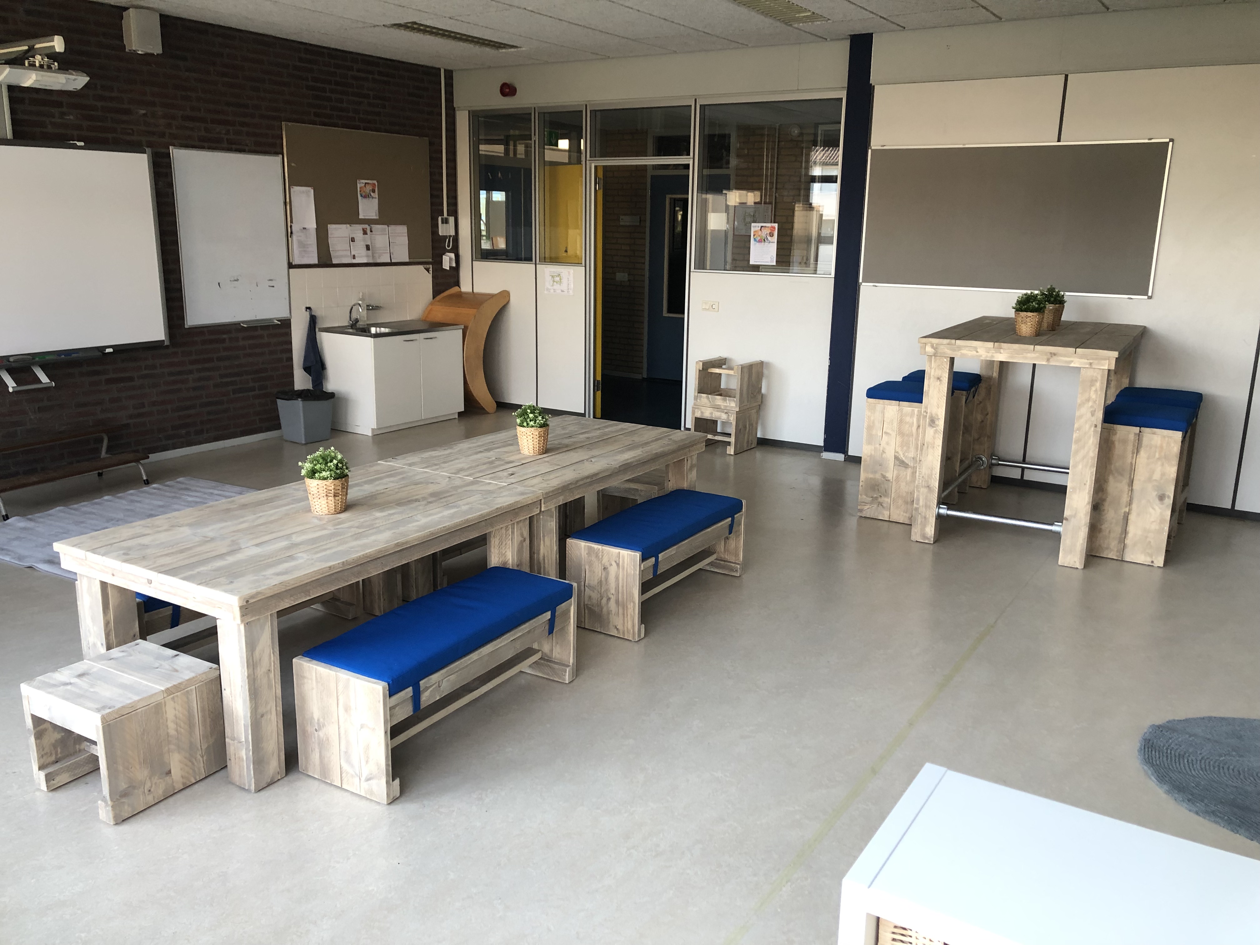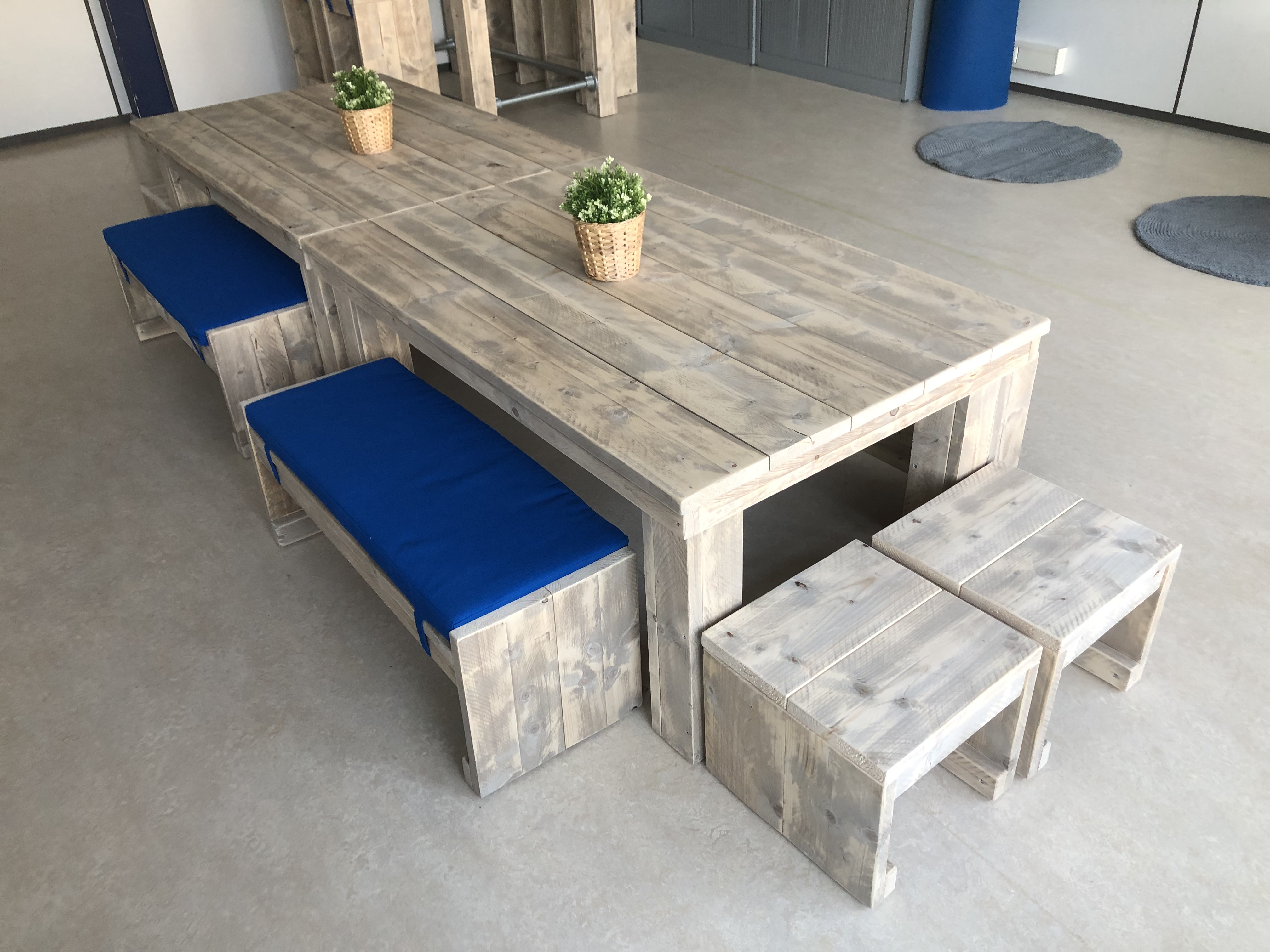 Wij kunnen het overgrote gedeelte van ons volledige meubilaire assortiment ook uitvoeren in berken multiplex voorzien van steigerhoutdecor