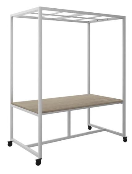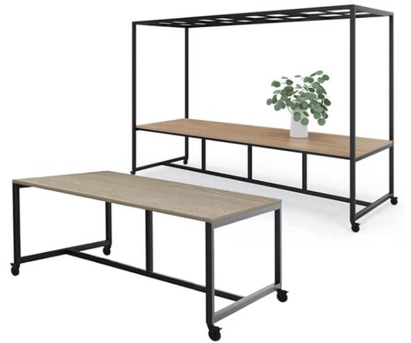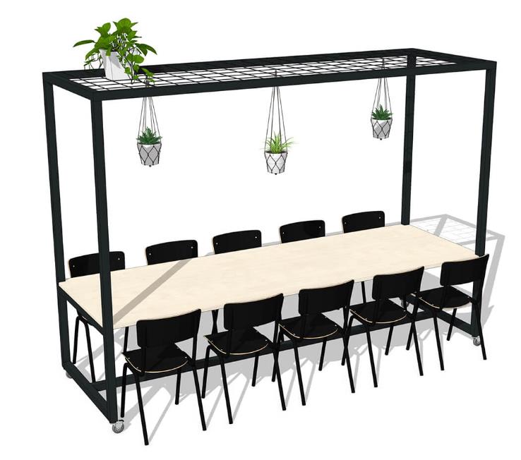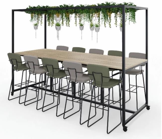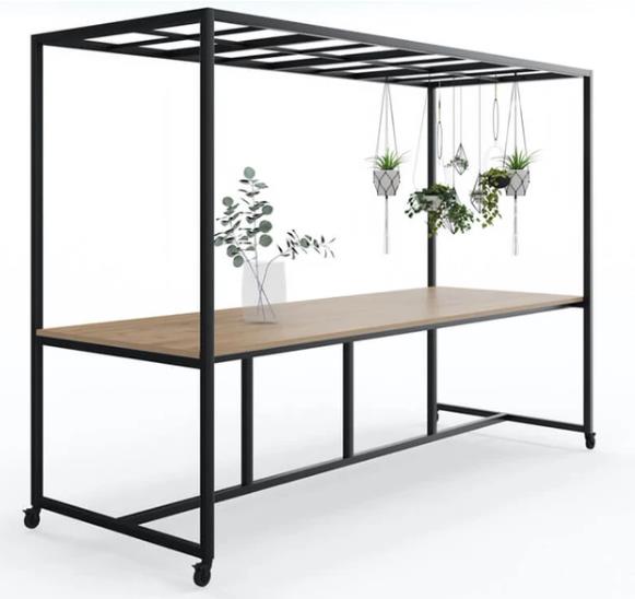 met hangende planten of lampen wat deze verrijdbare tafel uniek maakt.