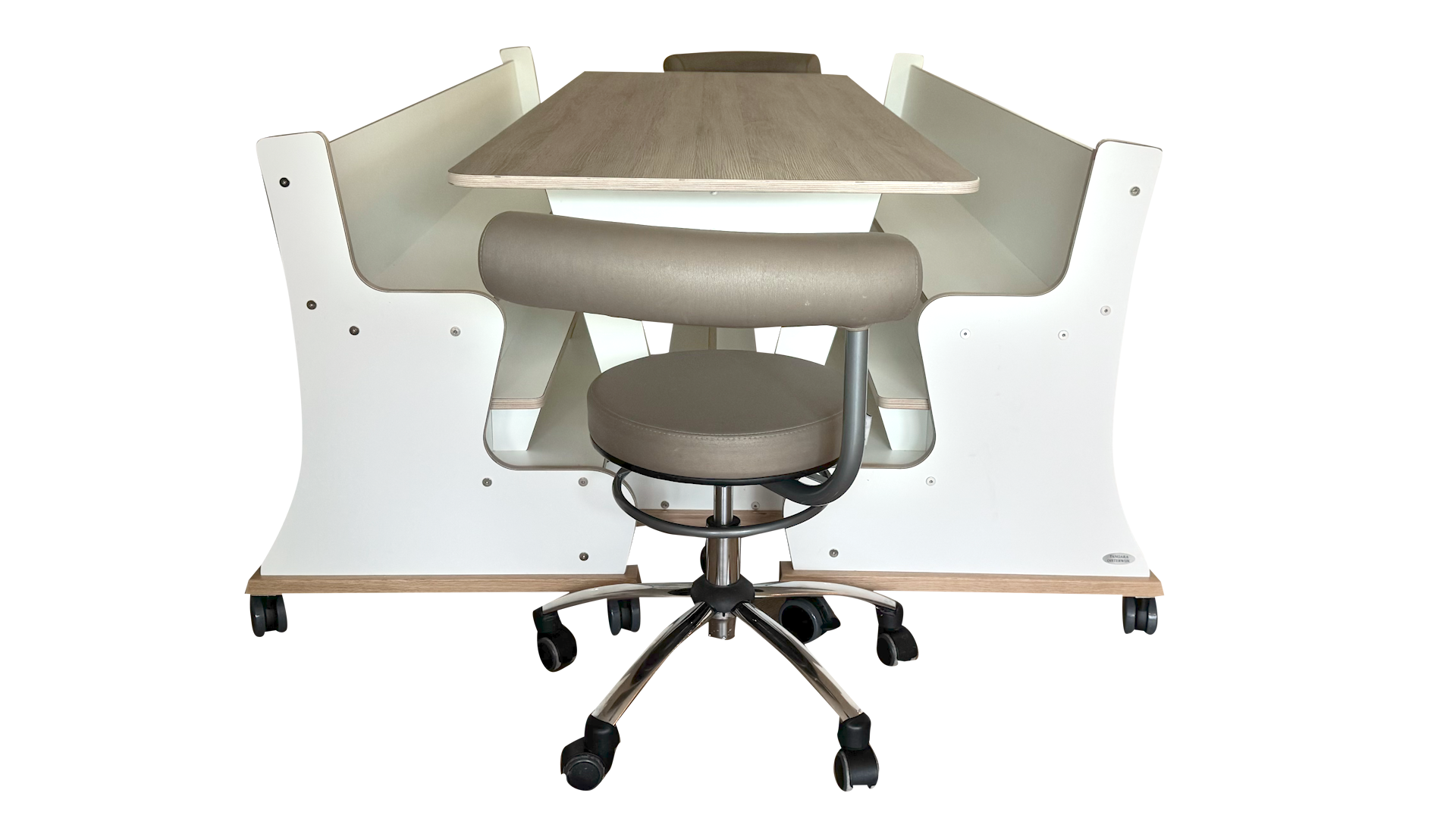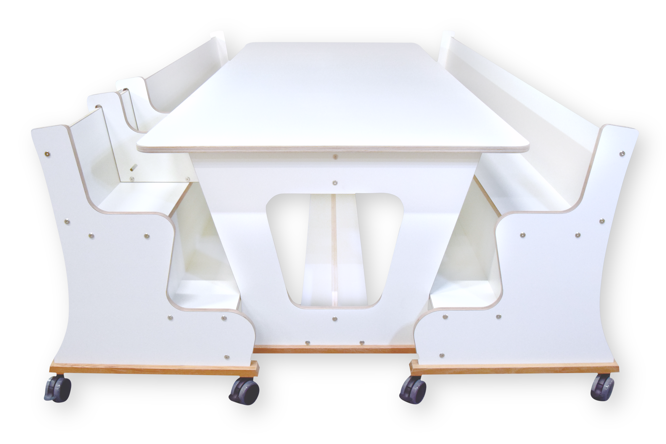De tafel en banken zijn opgebouwd uit 18mm berken multiplex met witte hpl toplaag,