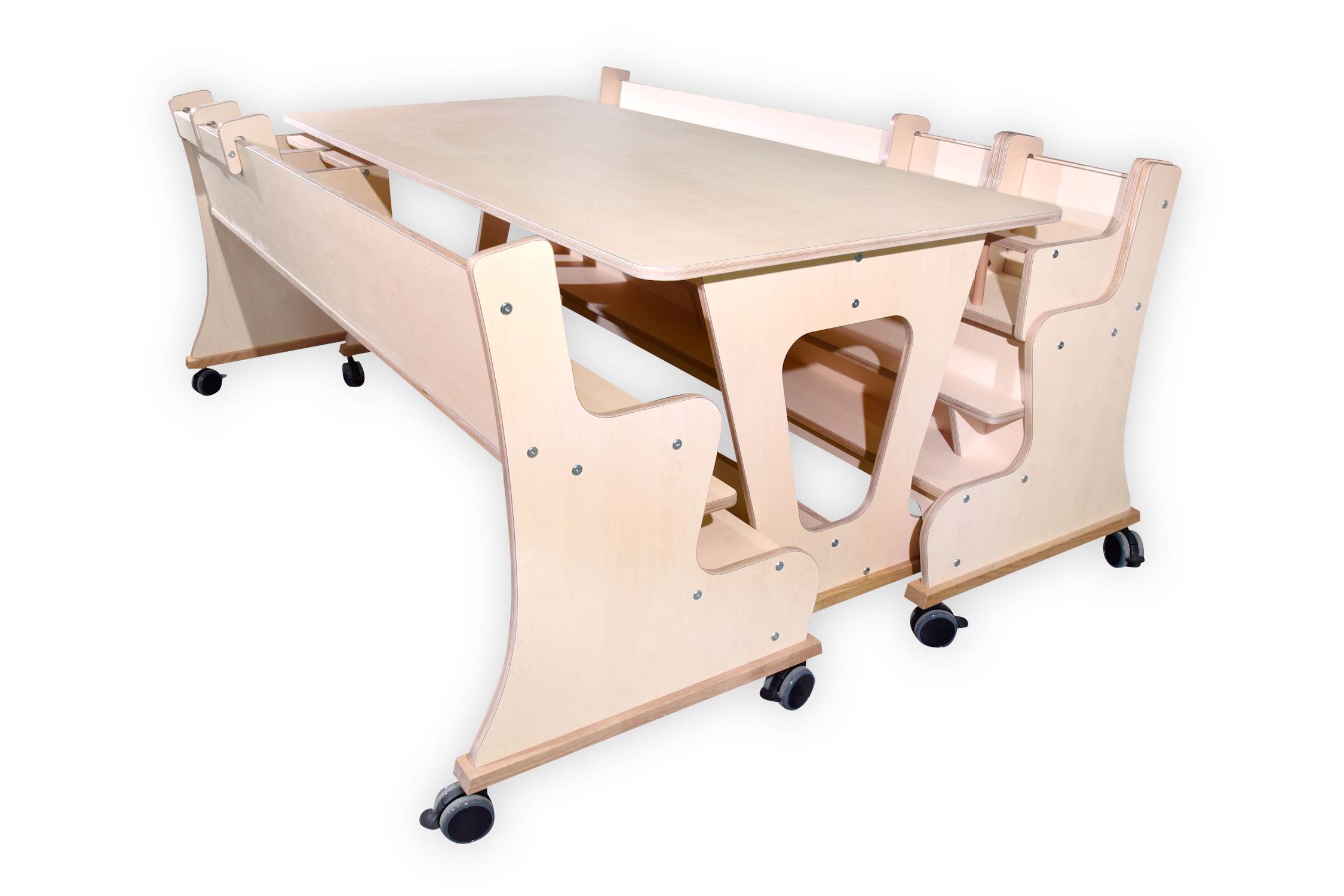 De tafel en banken zijn opgebouwd uit 18mm berken multiplex met witte hpl toplaag,