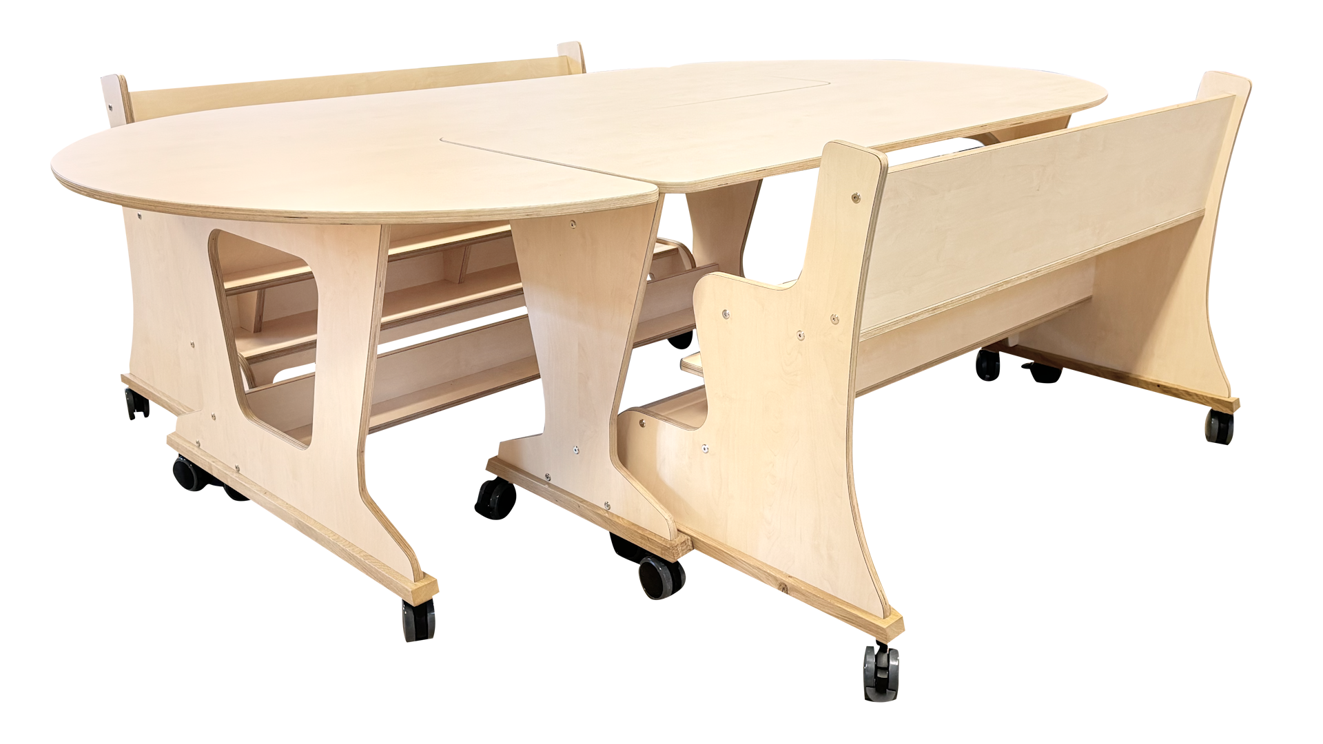De tafels zijn opgebouwd uit 18mm berken multiplex met witte hpl toplaag,