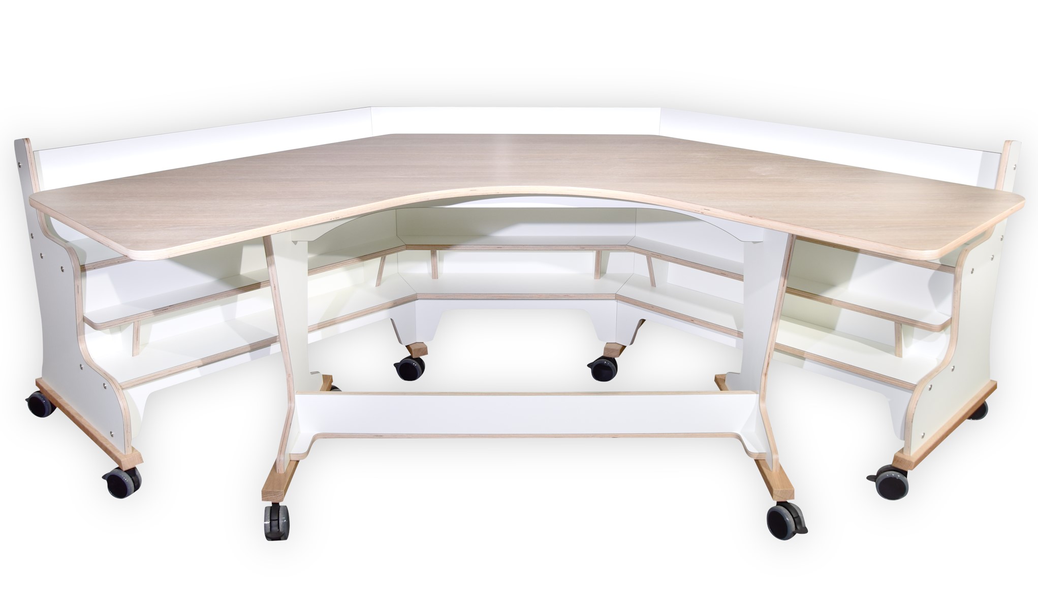 De tafels en banken zijn opgebouwd uit 18mm berken multiplex met witte hpl toplaag,